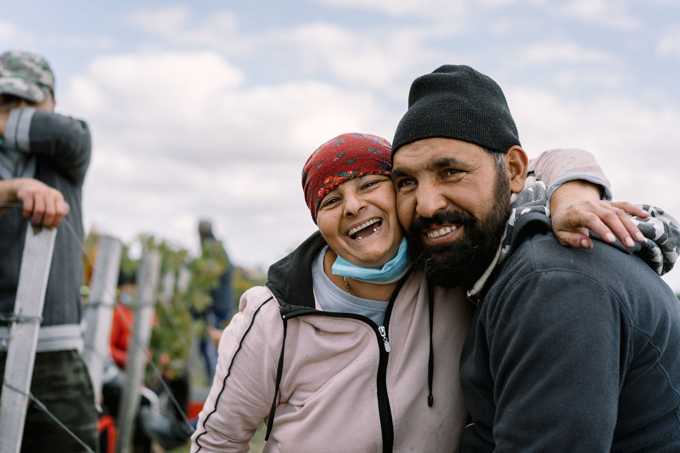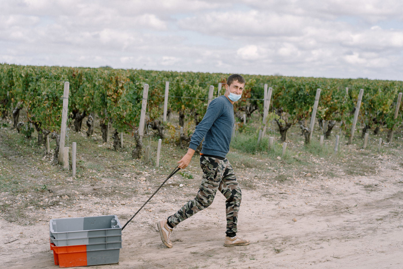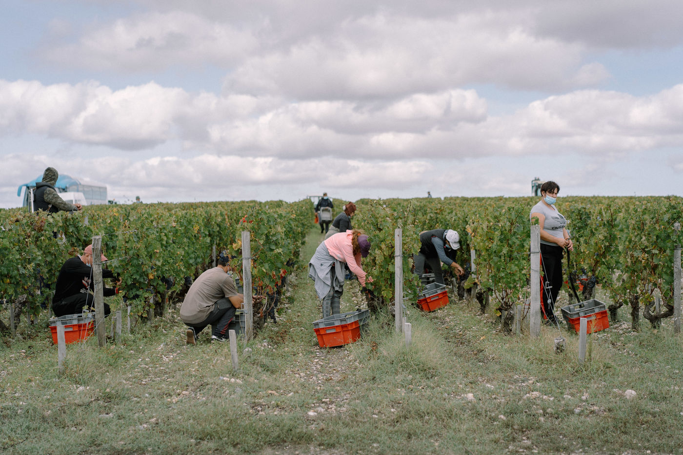 Everything is legal, following the rules of European union, workers are employed according to the french labour code, they have a contract and are paid according to the local minimal wages. Sleeping in the nearby camping, a bus brings them everyday in the wineyards for the 8 hours of daily work. Warmly dressed, it's nothing more than a usual day of work for them, this month in France, last month in England on a construction site, next month in spain for the harvest of peers before a well deserved rest at home in Romania where their families await for their returns.