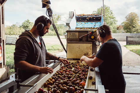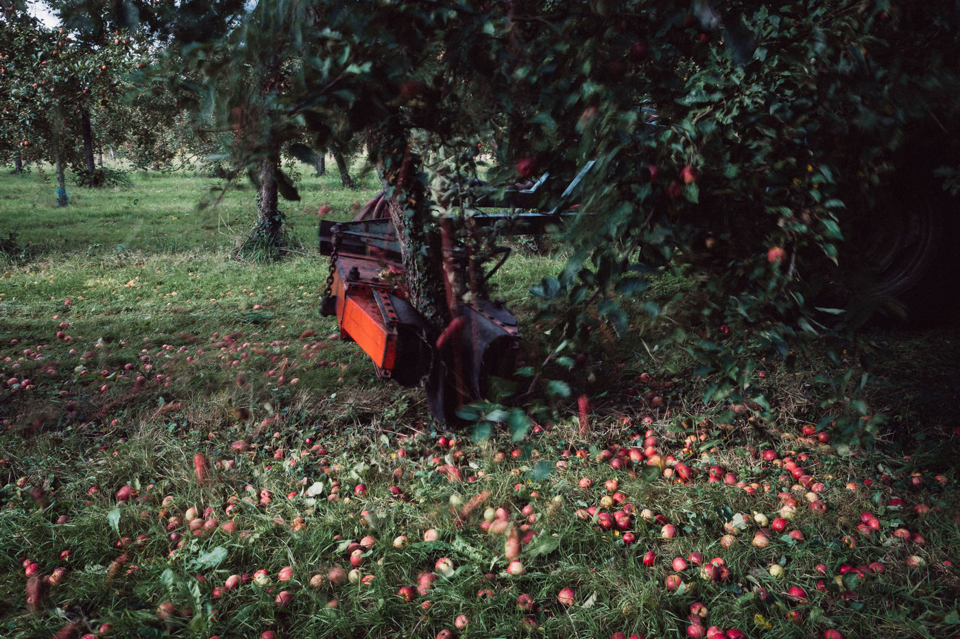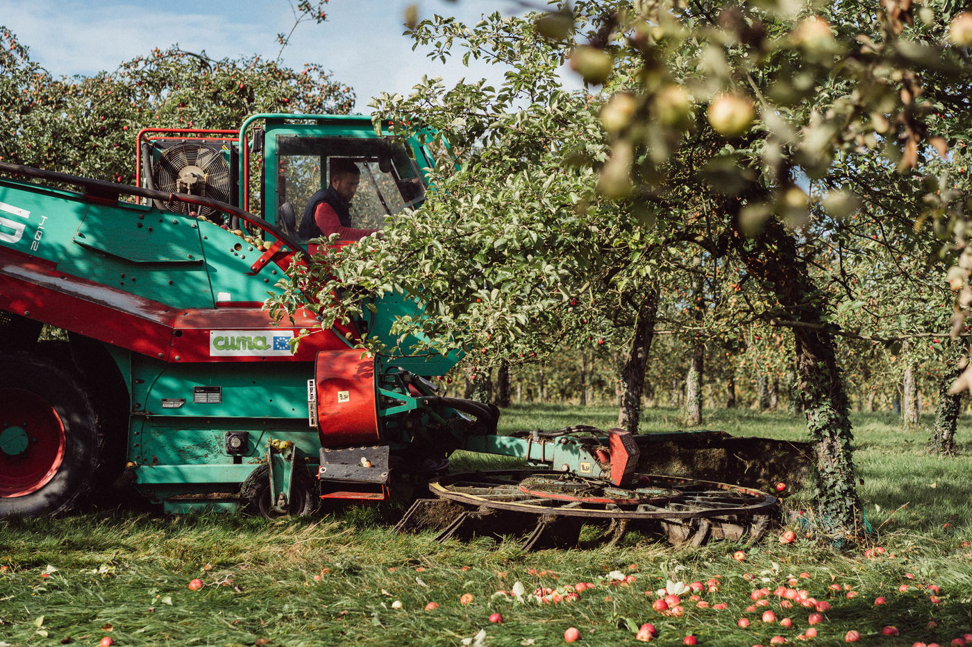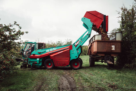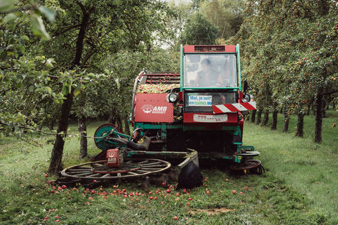 Dans le pays d'Auge en Normandie, la cidrerie Dupont s'adonnne a la recolte des pommes dans les vergés destinees ensuite à la production de cidre et de calvados.
