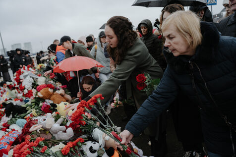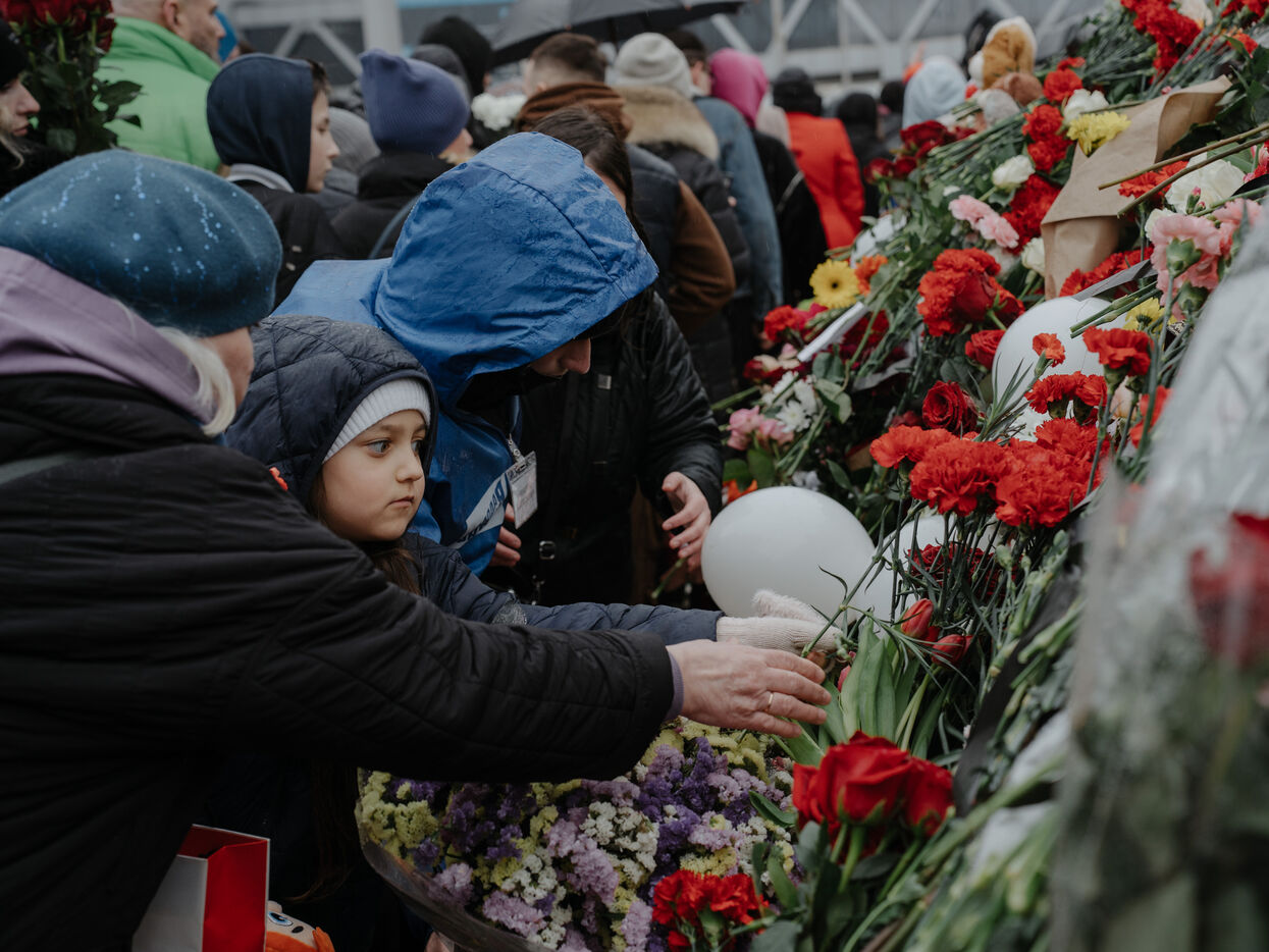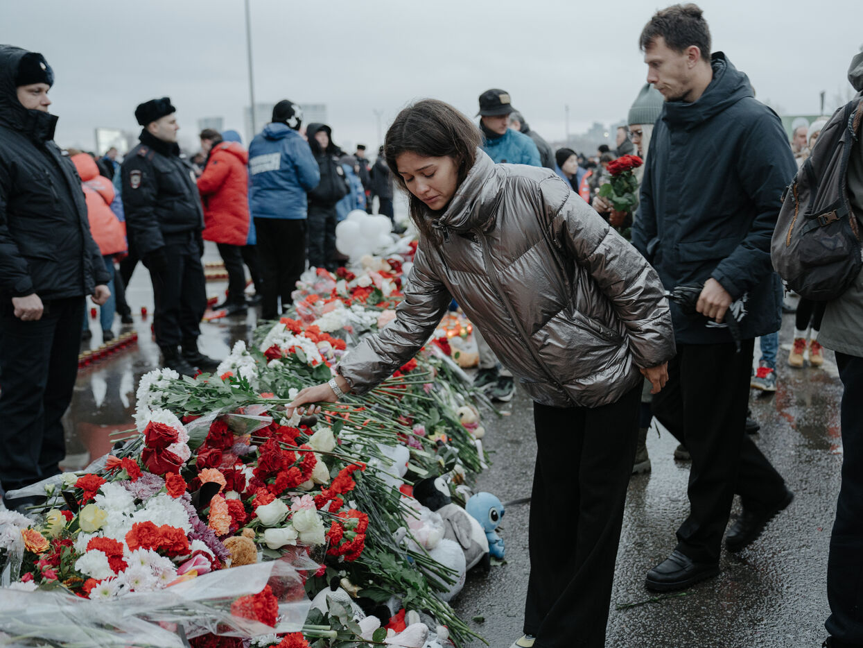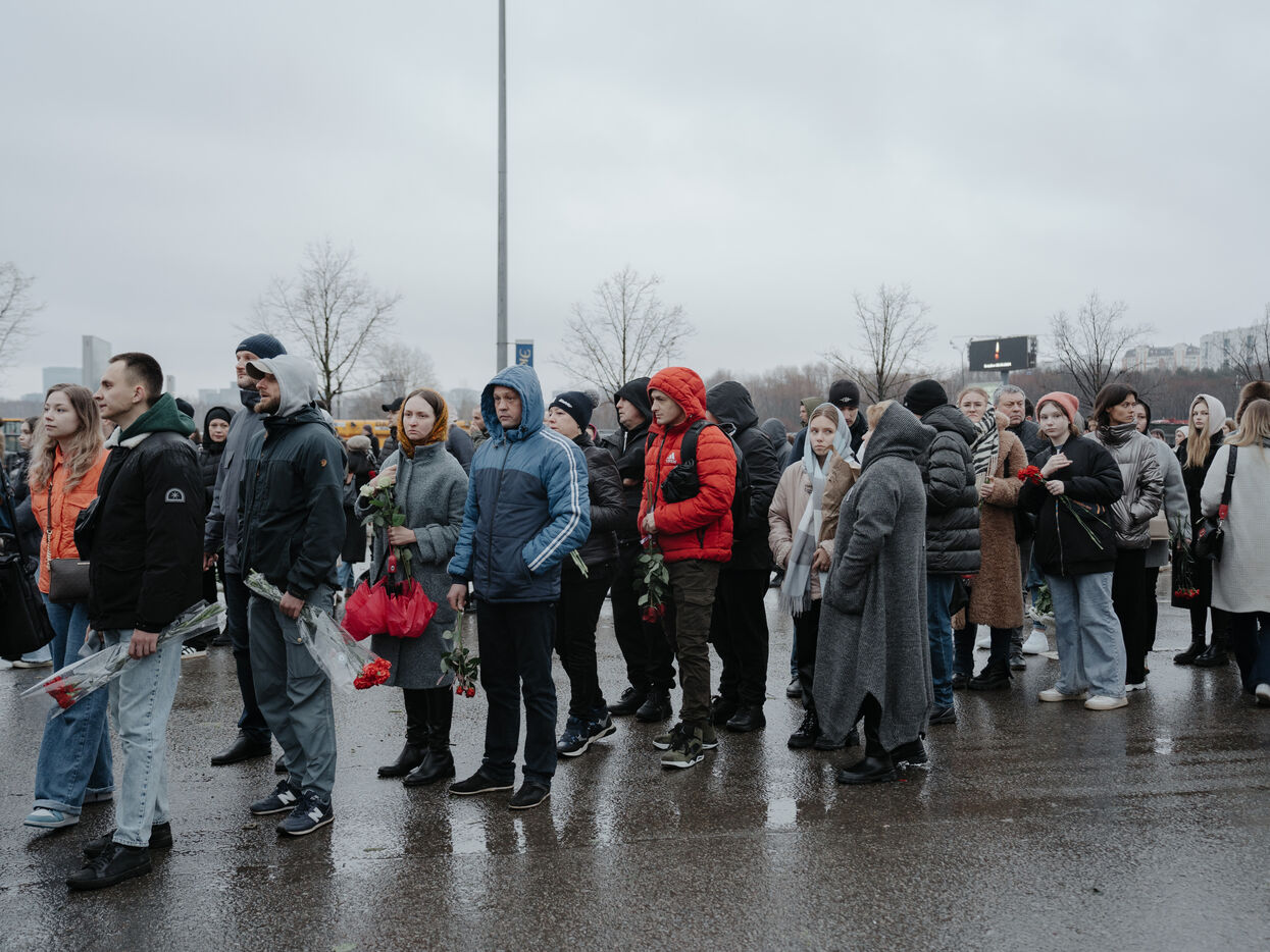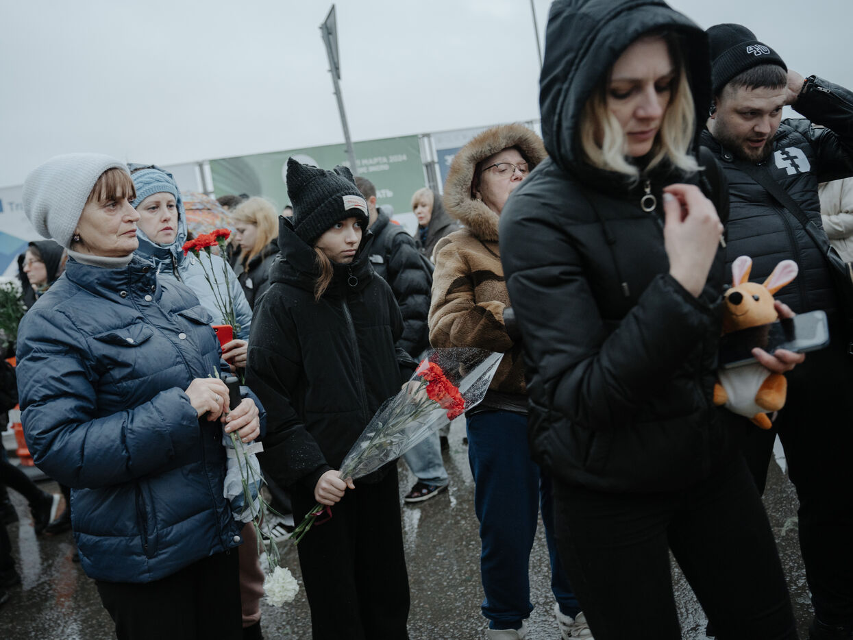 RUSSIA, MOSCOW. Hundreds of Russians gather to pay their respects and lay flowers at the site of the terrorist attack on March 22, 2024.