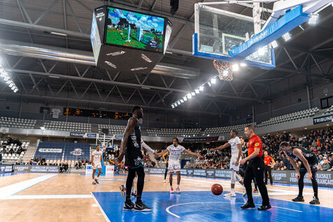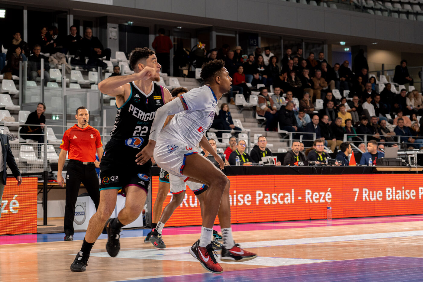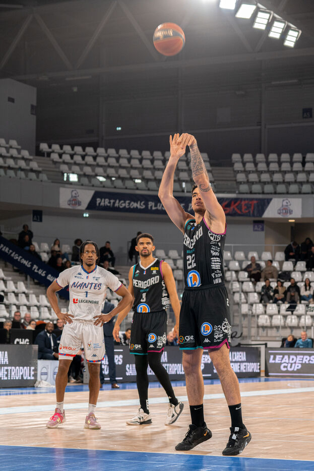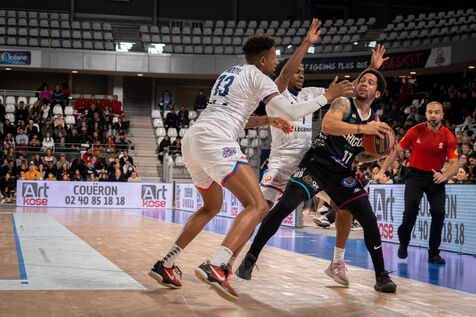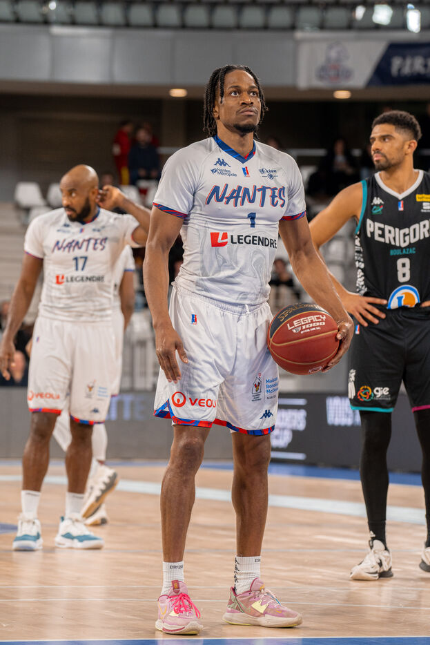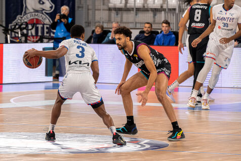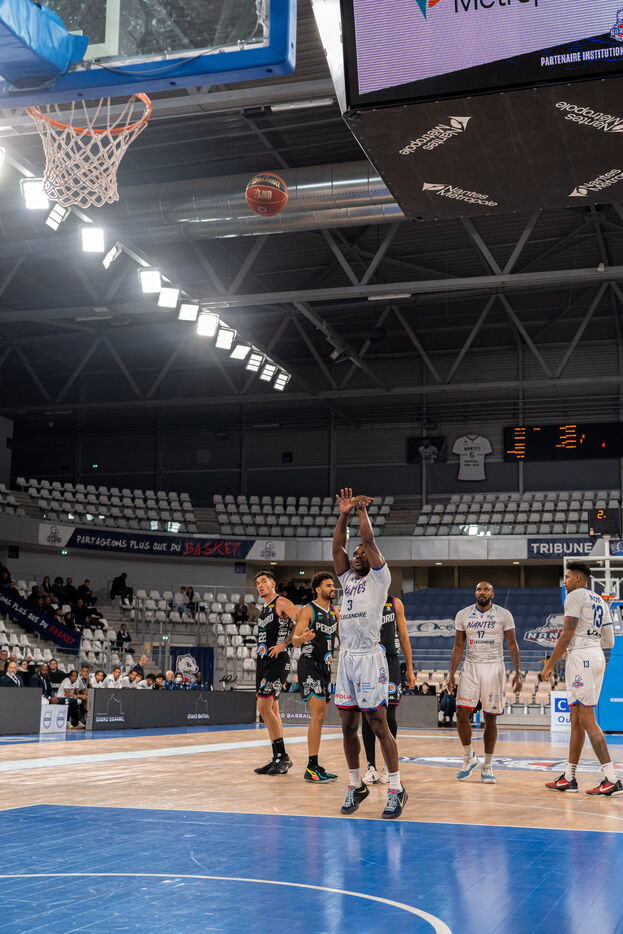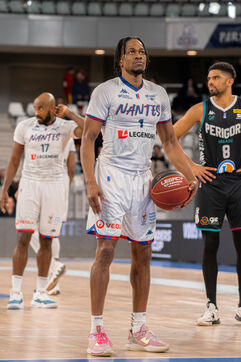 France, Nantes, le 16 décembre 2022. A la 10e semaine du championnat de France de basket-ball de deuxième division, Nantes s?incline de justesse face au Boulazac Basket Dordogne. Après une première mi-temps compliquée, le club de Nantes se réveille trop tardivement pour rattraper son adversaire qui ne le devance que de 10 points. C?est finalement le Boulazac Basket Dordogne qui remporte la victoire avec seulement 9 points d?avance (67-76) et finit à la quatrième place du classement provisoire, le club nantais quant à lui se positionne douzième sur le classement provisoire mais avec un match en moins de jouer par rapport à son adversaire. Le NBH rencontrera le Jeanne-d?Arc Vichy-Clermont Basket club pour sa dixième rencontre du championnat le 20 décembre prochain. Thomas Lukes / Hans Lucas.
