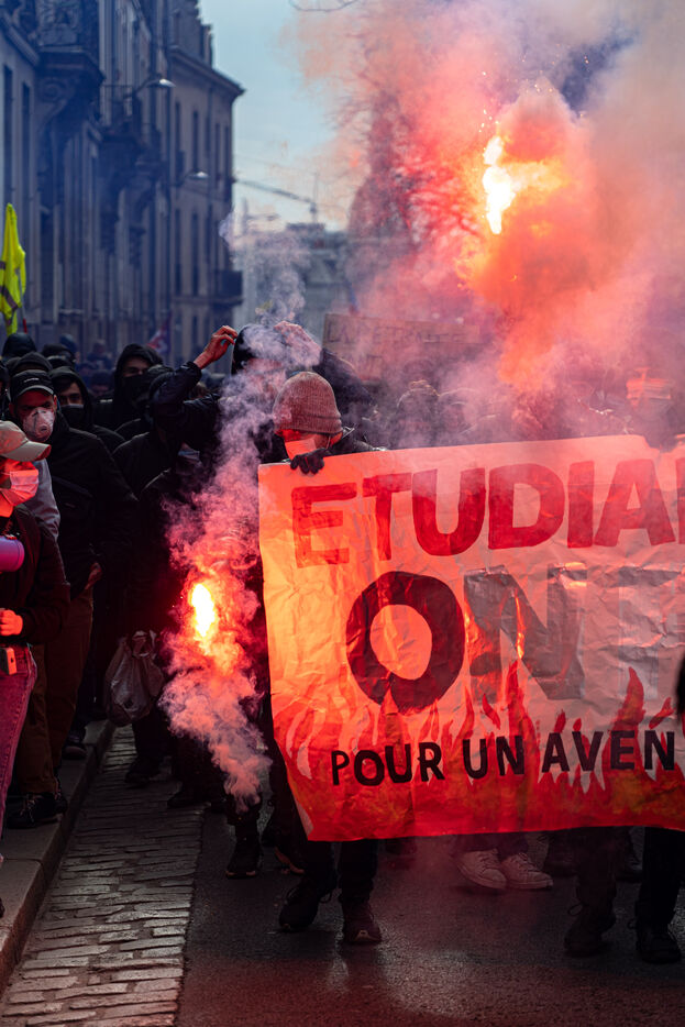 France, Nantes, le 7 mars 2023. Journée noire à Nantes où le nombre de manifestants bat des records comme partout en France. Environ 75 000 personnes - sources syndicales- sont descendu dans les rues pour réclamer une justice sociale et le retrait de la nouvelle réforme des retraites ainsi que du gouvernement de E.Macron. Le cortège de tête, composé principalement de jeunes et de groupes plus radicaux dont les fameux "black blocs", a tenté à plusieurs reprises de se séparer du reste de la manifestation en pénétrant dans les rues adjacentes mais est repoussé par les forces de l'ordre usant abondamment de gaz lacrymogène. Finalement la totalité du cortège n'atteindra pas le point d'arrivée de la manifestation à cause des affrontements ayant lieu entre forces de l'ordre et manifestants sur l'ïle de Nantes. Thomas Lukes / Hans Lucas