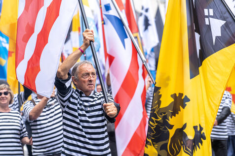 France, Quimper, 2023-23-07. Près de 2000 danseurs et musiciens se sont rassemblés ce dimanche en clôture du 100e festival de Cornouaille à Quimper et ont pris part à un défilé en musique, acclamé et applaudi par une foule amassée sur les trottoirs malgré la pluie.