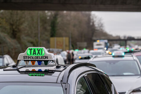 France, Brest, le 29 janvier 2024. Une centaine de taxis se sont rassemblés à Brest, comme dans plusieurs autres grandes villes de France, s'opposant à la non-revalorisation de la course minimum et la nouvelle convention de la CNAM.