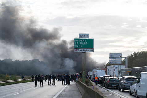 France, Rennes, September 10, 2025, several gatherings were organized on social networks to block the city. About 250 protesters gathered at 7 a.m. near the Henry-Fréville metro station to block the southern ring road of Rennes.