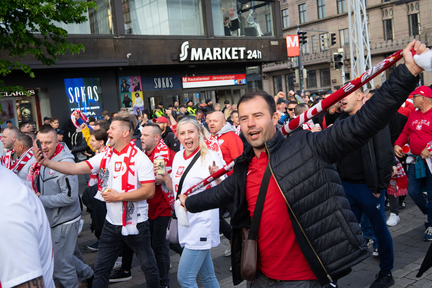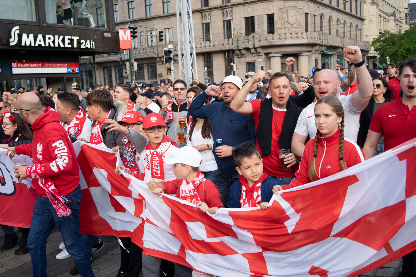 A crowd of football supporters from Poland march through the centre of Helsinki, Finland while they are heavily escorte by the police, on their way to the 2026 FIFA World Cup qualifying football match between Finland and Poland on June 10, 2025.