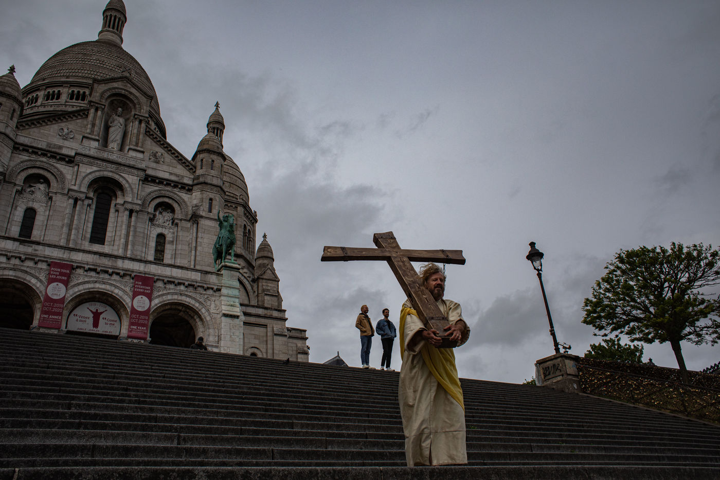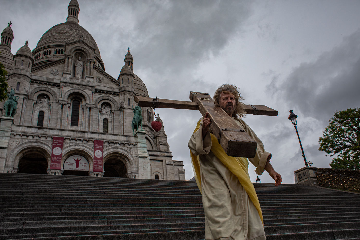 Paris, le 29 avril 2020 . La France est placée dans une situation de confinement quasi total pour arrêter la propagation de l'épidémie de Covid-19. Près du Sacré-C?ur, un homme vêtu du Christ porte sa croix. Il se fait appeler "Gilet jaune de Jésus" et veut continuer à maintenir le mouvement en vie pendant le confinement