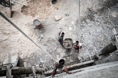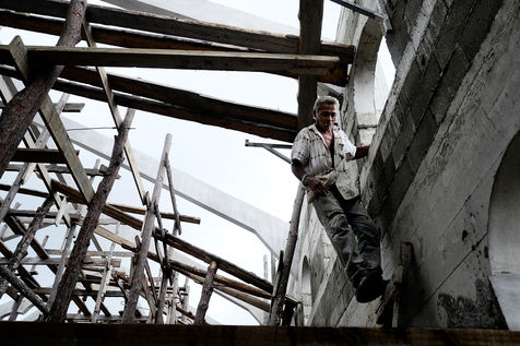 Elle nous mène d'abord à travers des chantiers d'un autre âge, où l'on travaille encore à la gloire de Dieu, pieds nus et sans aucune protection, souvent à des hauteurs vertigineuses.