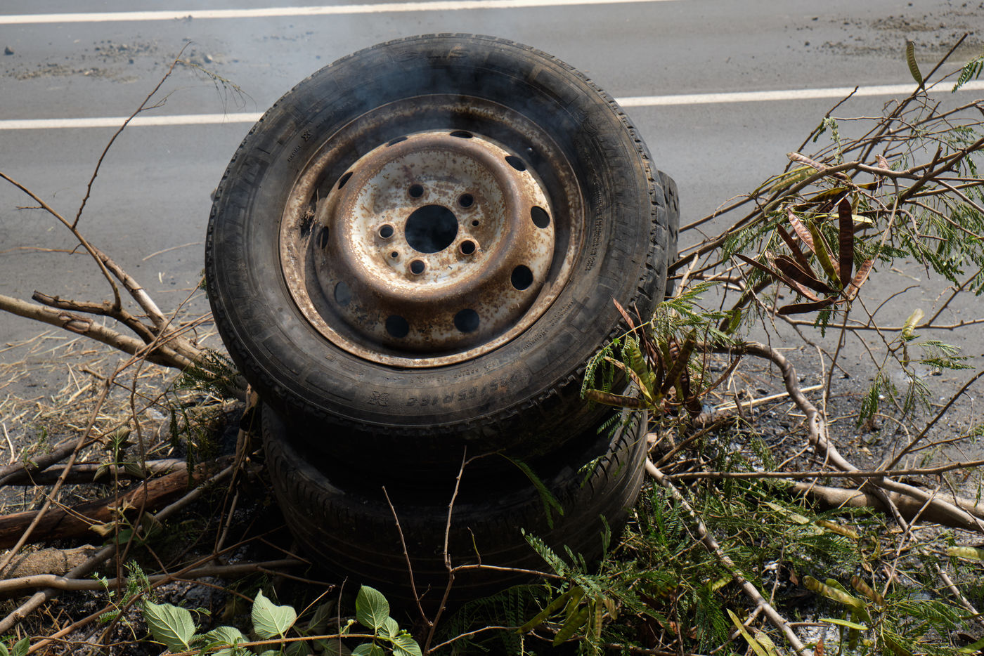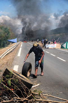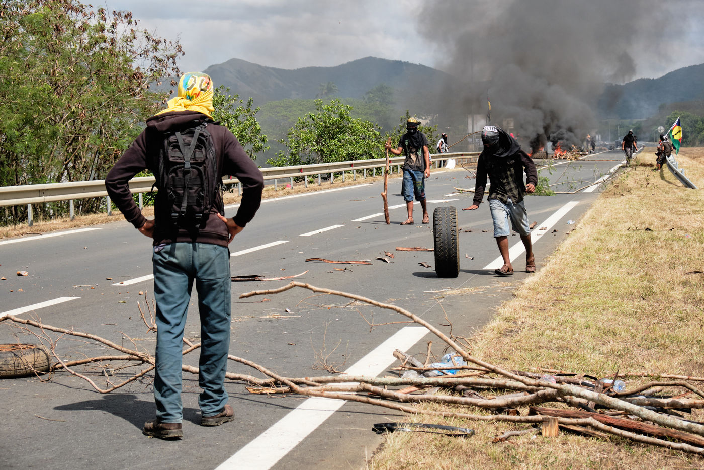 Paita, Tuesday, December 8, 2020. Opponents to the sale project of the Vale NC plant held a filtering dam on the main road leading to the agglomeration of Noumea. Reunited under the slogan "let's defend our resources", the "Usine du Sud - Usine Pays" collective opposes for many weeks to the possible sale of the Vale nickel plant, backed by the rich Goro deposit, to a Caledonian and international consortium led by the swiss trader Trafigura. Opponents are asking for stronger representations of Caledonian institutions in the shareholding as well as environmental guarantees. Photograph by Theo Rouby / Hans Lucas