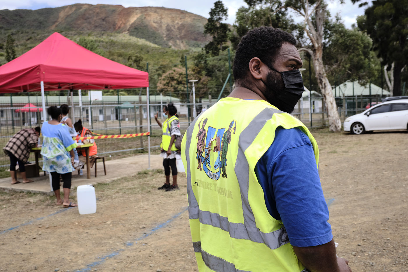 Nouvelle-Caledonie, Kouaoua, samedi 25 septembre 2021. La commune minière de la côte Est organise une opération de vaccination de proximité pour les populations des tribus kanak environnantes. L'épidémie de Coronavirus progresse en Nouvelle-Caledonie depuis début septembre, alors que seulement 50 % de la population a reçu une dose et que la campagne de vaccination ralentie.