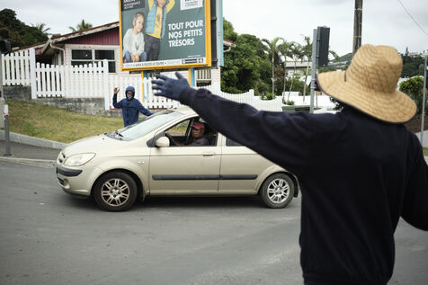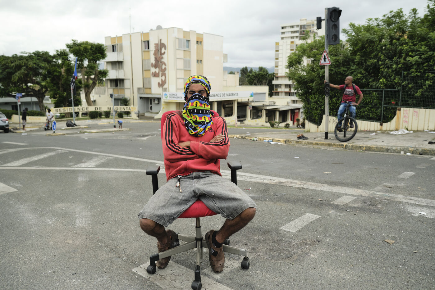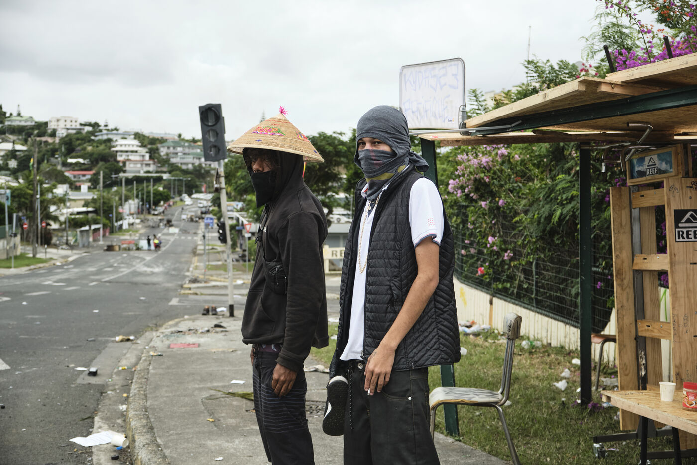 Dans le quartier de "Magenta Tours", ou l appaisement est palpable ces derniers jours, de jeunes independantistes ont remplace les barricades par des barrages filtrants et assurent la circulation, Noumea, Nouvelle Caledonie, mercredi 22 mai 2024. La revendication contre le degel du corps electoral se poursuit alors qu'Emmanuel Macron est attendu dans la nuit.