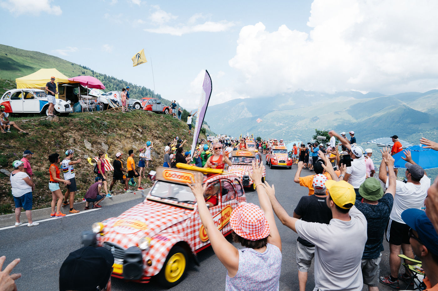 Deux heures avant la course, un cortège de 160 véhicules publicitaires "pimpés" s'engagent sur la route pour motiver les foules.