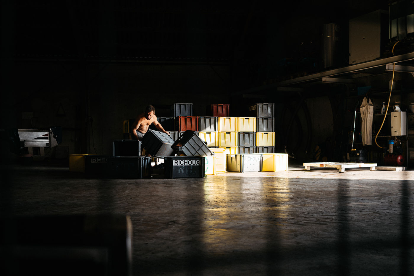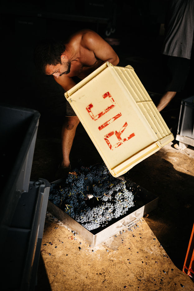 A la fin de la journée, les caisses de raisins sont déversées dans les cuves puis nettoyées pour répéter le processus le lendemain.