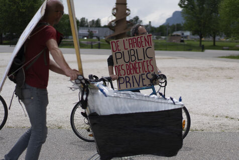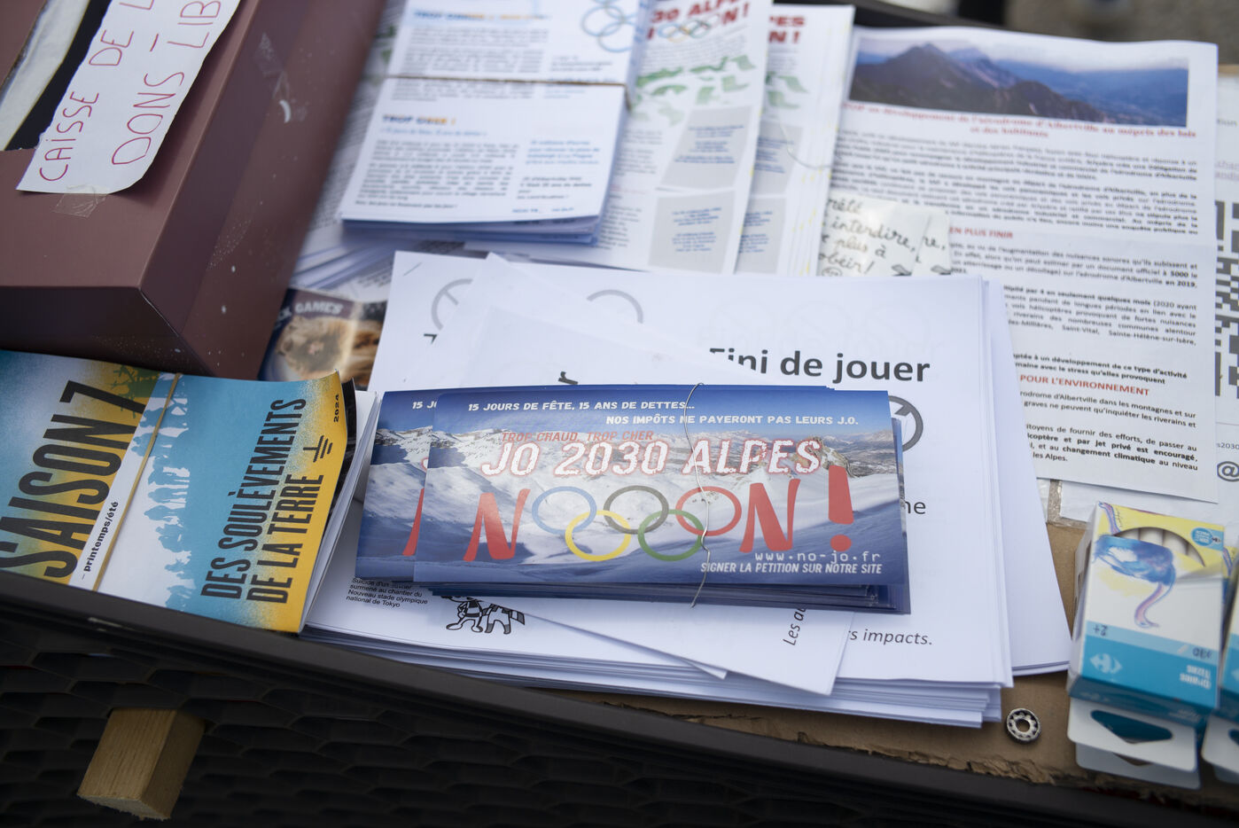 Des manifestants protestent contre l'organisation des jeux olympiques d'hiver 2030 dans les Alpes françaises à Albertville (Savoie, France).
