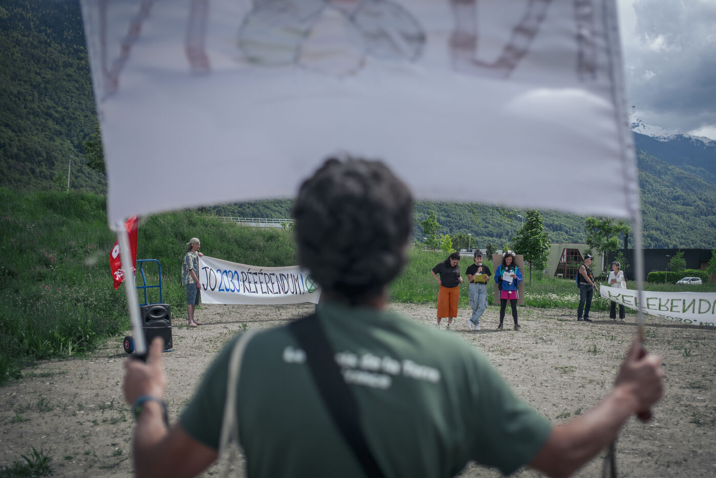 Demonstrators protest against the organization of the 2030 Winter Olympics in the French Alps at Albertville (Savoie, France)