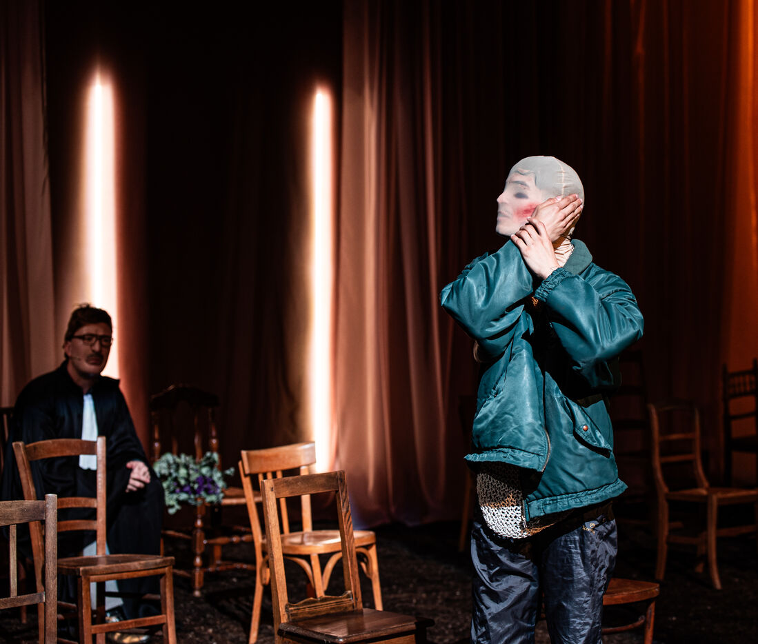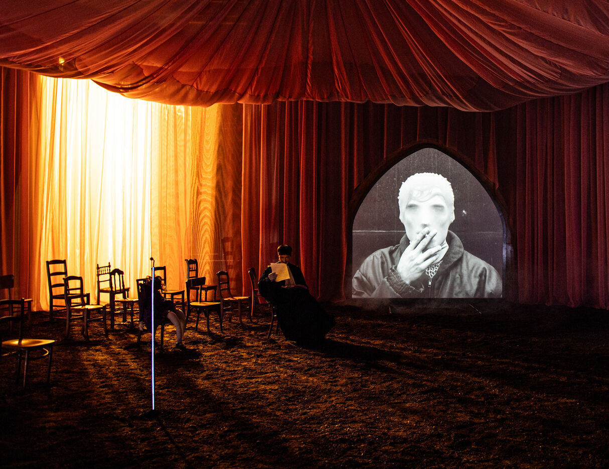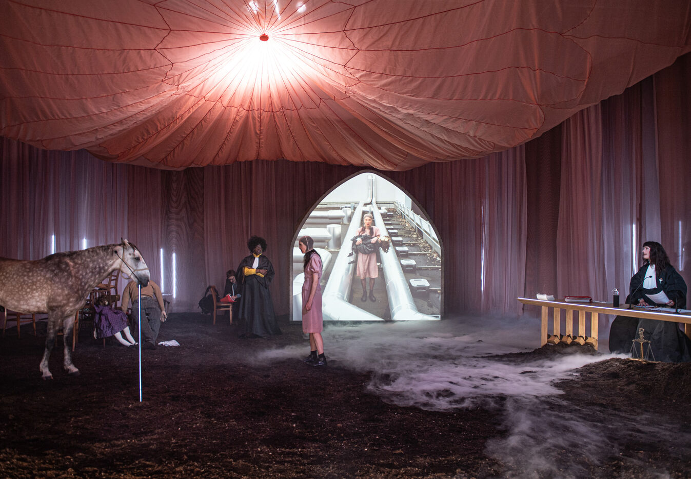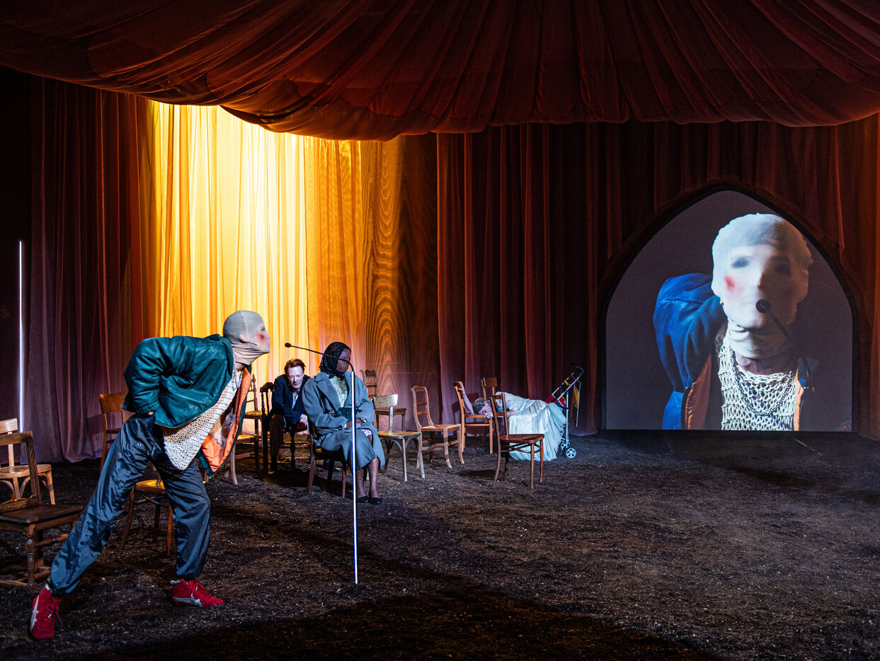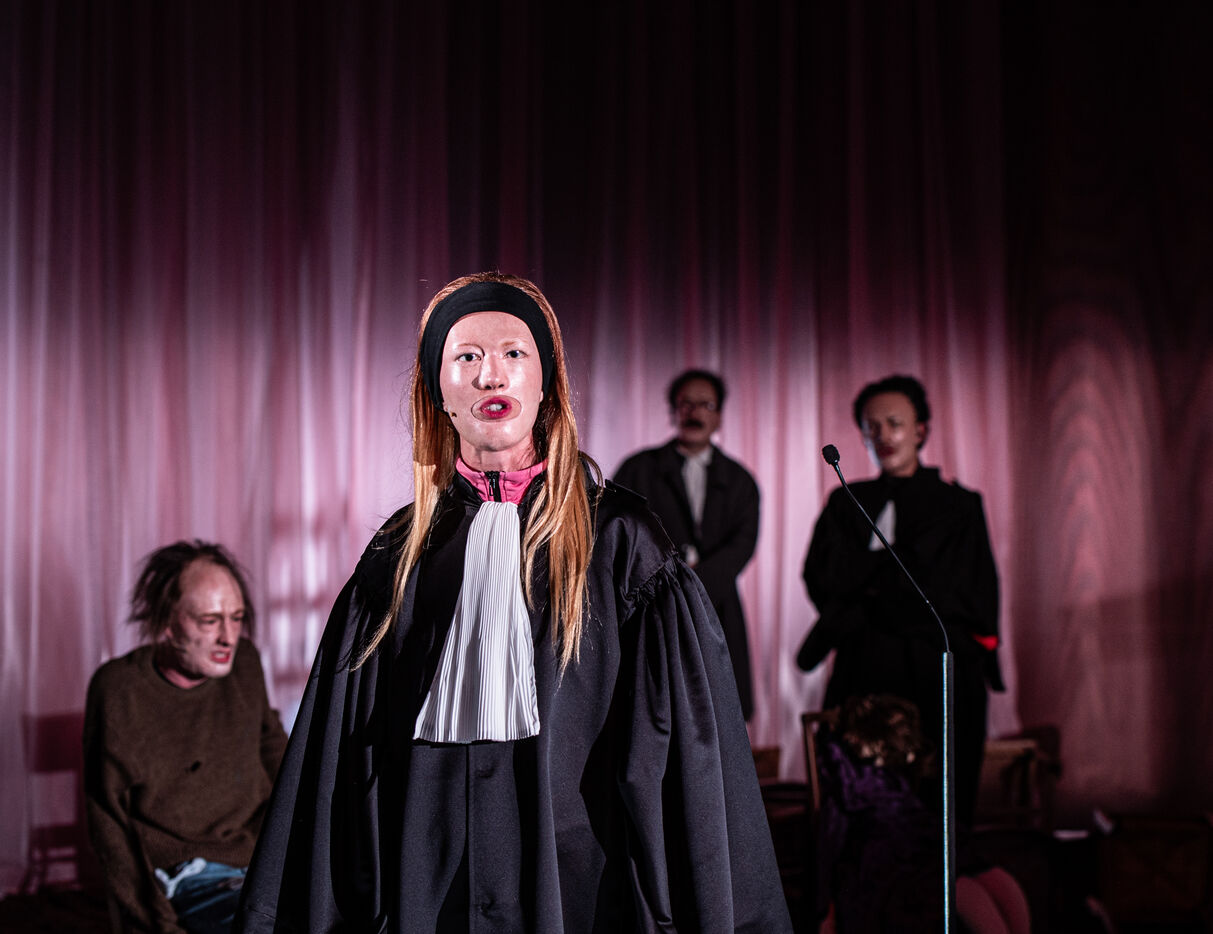 Created after a long immersion in the heart of the penal system, and particularly immediate appearance trials, Léviathan questions the fairness of institutional justice. Working with author Guillaume Poix, Lorraine de Sagazan draws inspiration from transformative justice and other alternatives to the traditional judge-punish-imprison model. Under a tent that serves as a makeshift courtroom, an echo to the installation presented at the Collection Lambert, Léviathan tries to understand—beyond good and evil—the ties between the legal system and the inequalities that govern our society, overturning certain obvious truths in the process. Through the biblical figure of the Leviathan, the show confronts us with violence and its regulation by law, asking this crucial question: who is the monster?