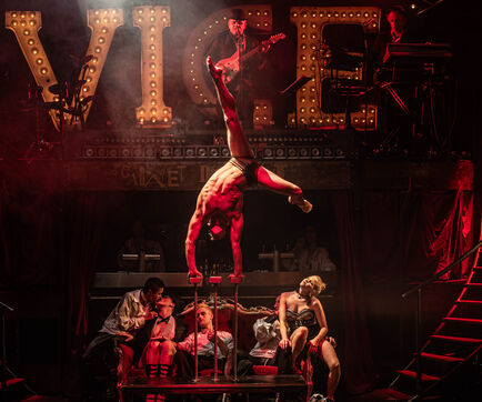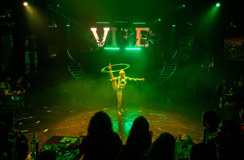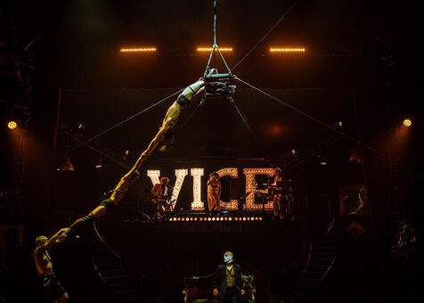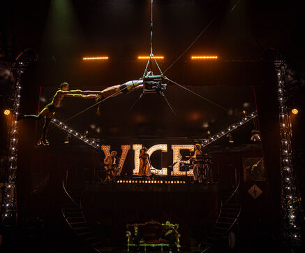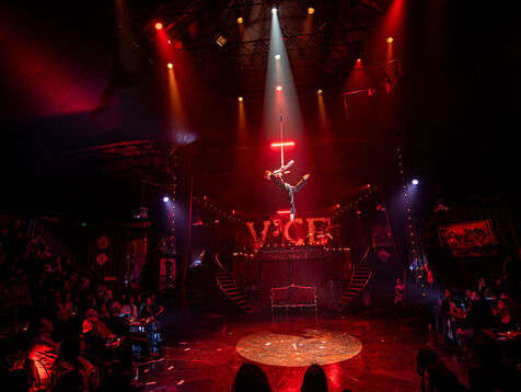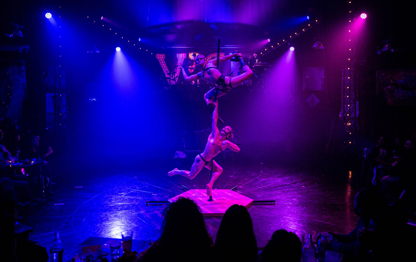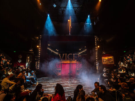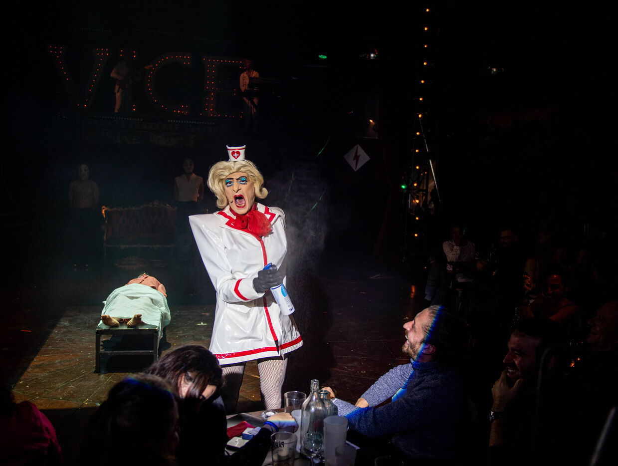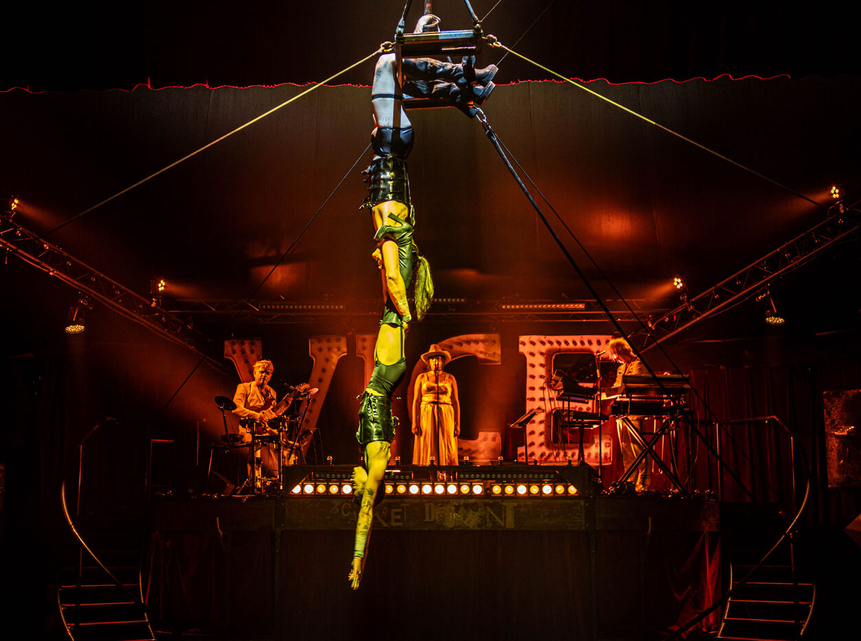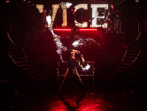 CABARET DÉCADENT, REVUE ÉLECTRIQUE N°777 VICE, Dans une ambiance de soufre et de sueur, hammam de boîte de nuit, vapeurs et fumée noire, les langues se délient, speakeasy, les corps se liquéfient, techno crade et saturée, une boule à facettes dans le ventre, reprendre son souffle, le vice est à vos portes. Pouvoir, luxure, argent, poisons d’une époque damnée. Violence, feu, métal bouillant, venin des entrailles d’une société finissante et vérolée, personnages de Marvel trop maquillés. Danse debout, cri à genou, aboiements de chiens, claquettes sur cannettes, podium central atomique, electro-vice, tacatacatacatac, politique enrayée, déclamations poétiques. Cirque vulgaire et cabaret du pauvre : le bal des perdus. Maudits, déviants, monstres et paillettes, fête brouillonne, messe vaudoo, non pas de messe, juste du vin, des jeux, je suis sensuel(le), torrida, une electric ladyland, insolente liberté électrique.