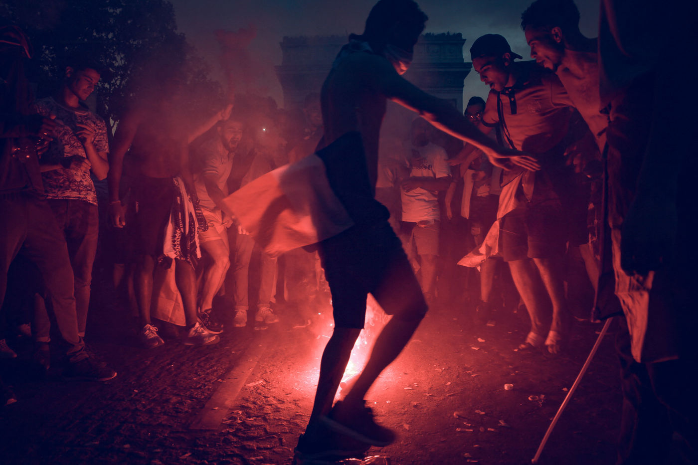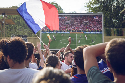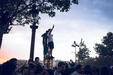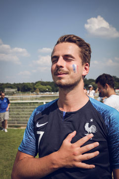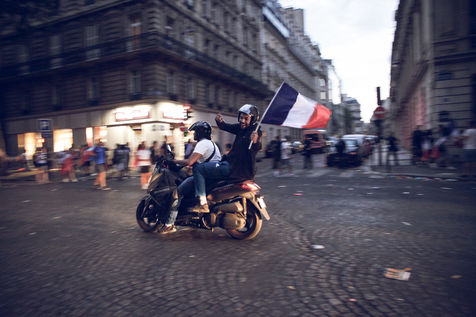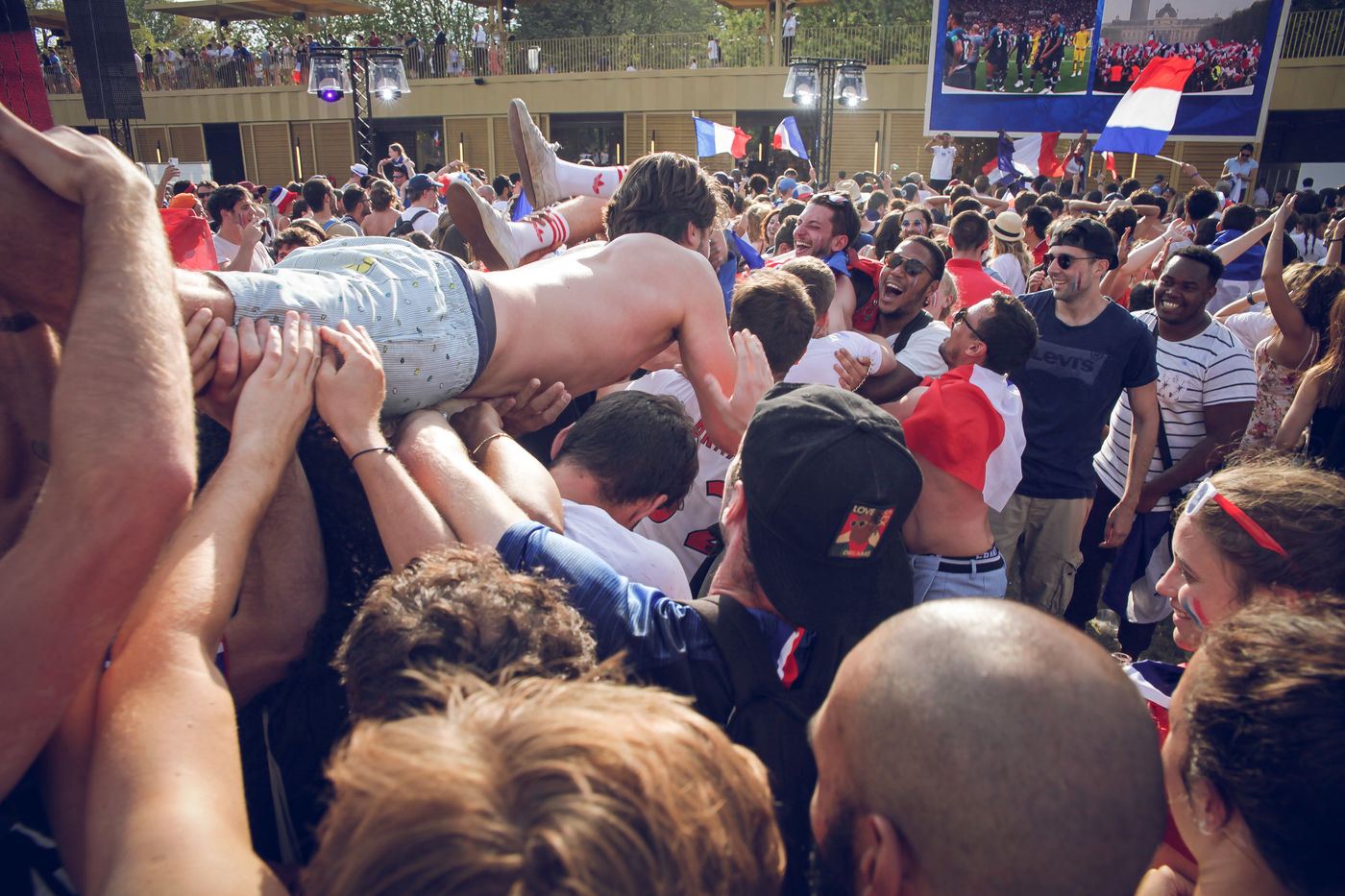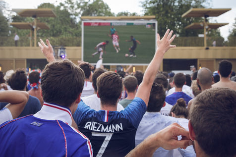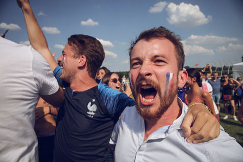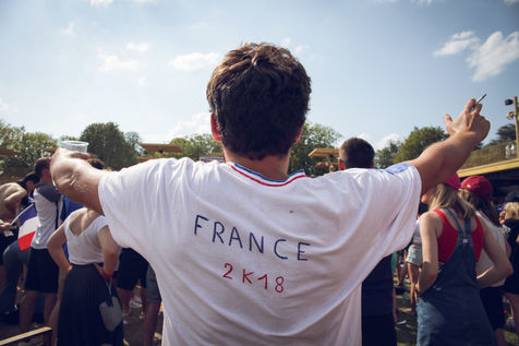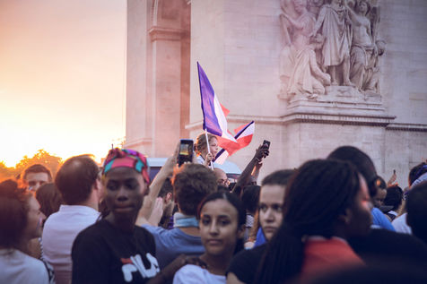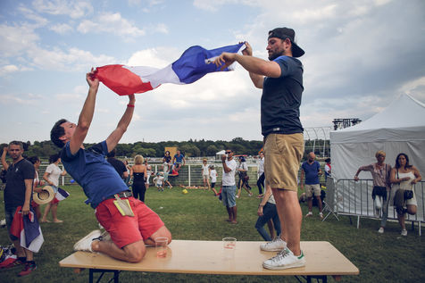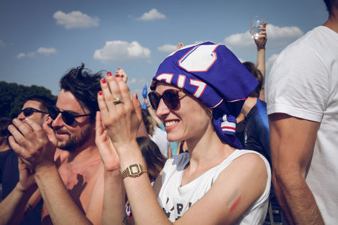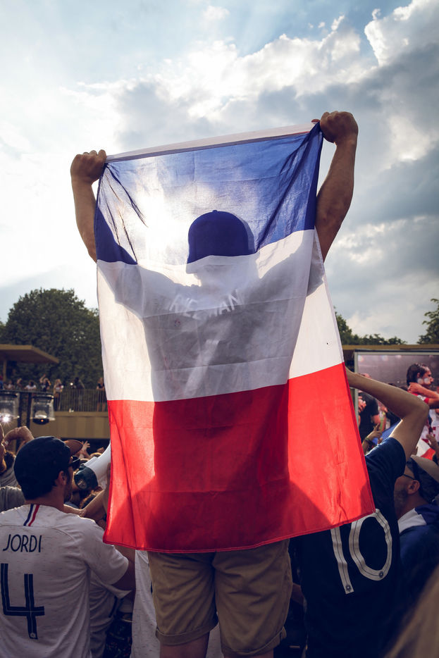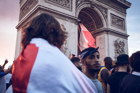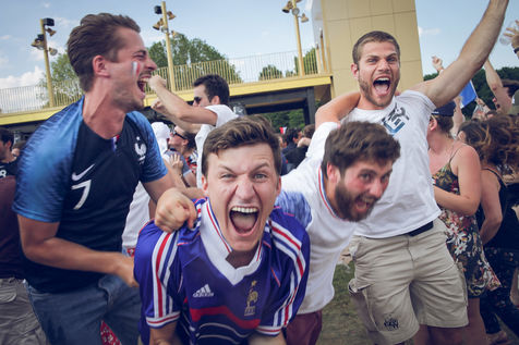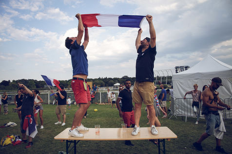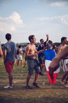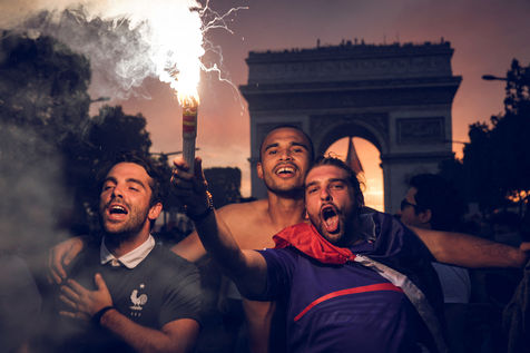 Paris, le 15 Juillet 2018. Des milliers de supporters sont rassemblés pour regarder la finale de la Coupe du Monde de football. La France remporte le trophée pour la deuxième fois de son histoire, ses supporters exultent. S'en suivent des scènes de liesses à Paris.