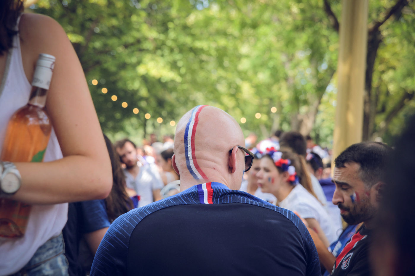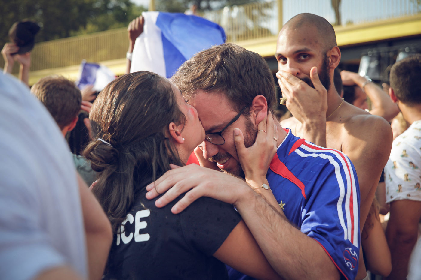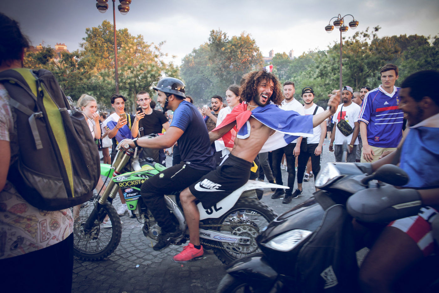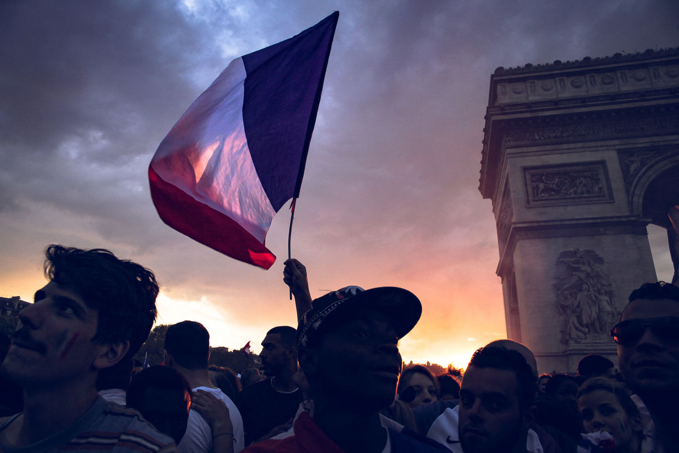 Paris, le 15 Juillet 2018. Des milliers de supporters sont rassemblés pour regarder la finale de la Coupe du Monde de football. La France remporte le trophée pour la deuxième fois de son histoire, ses supporters exultent. S'en suivent des scènes de liesses à Paris.