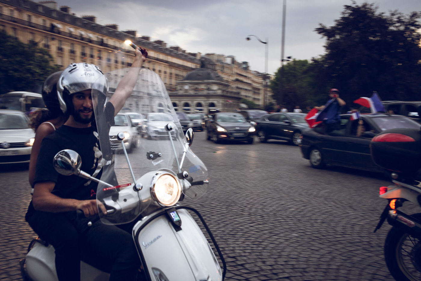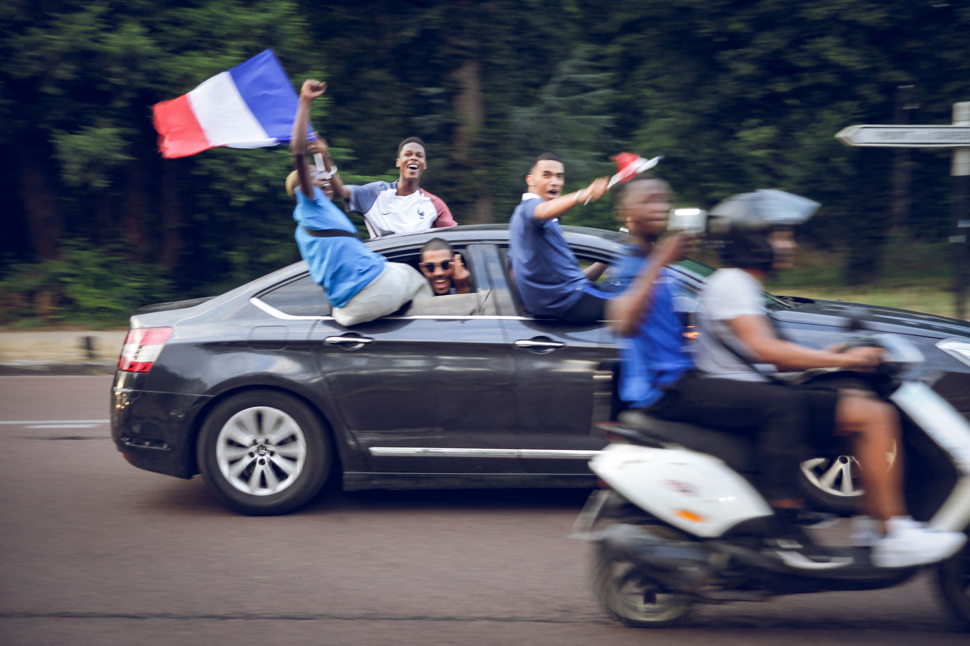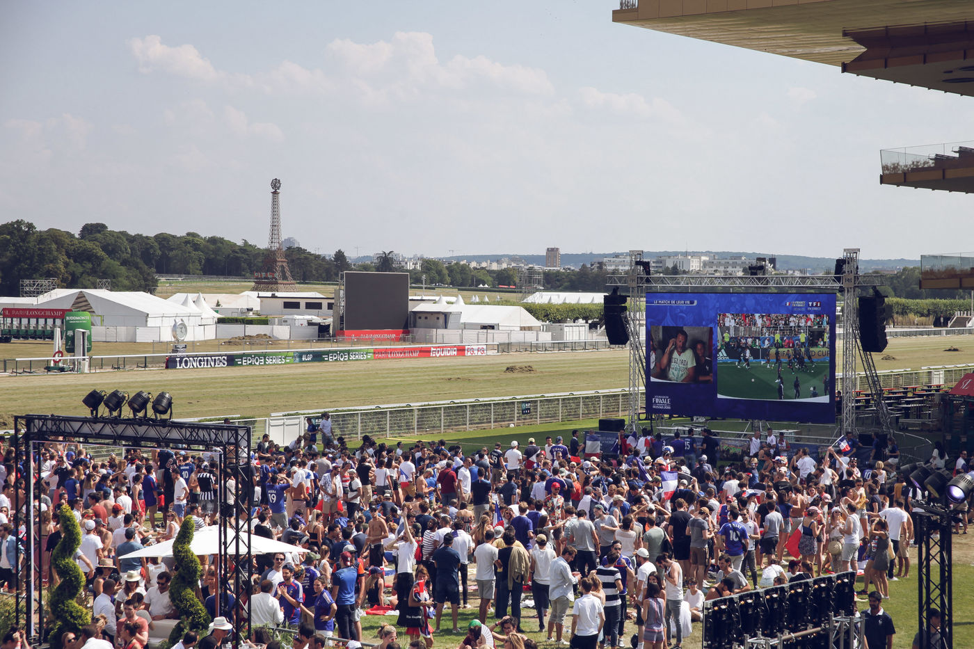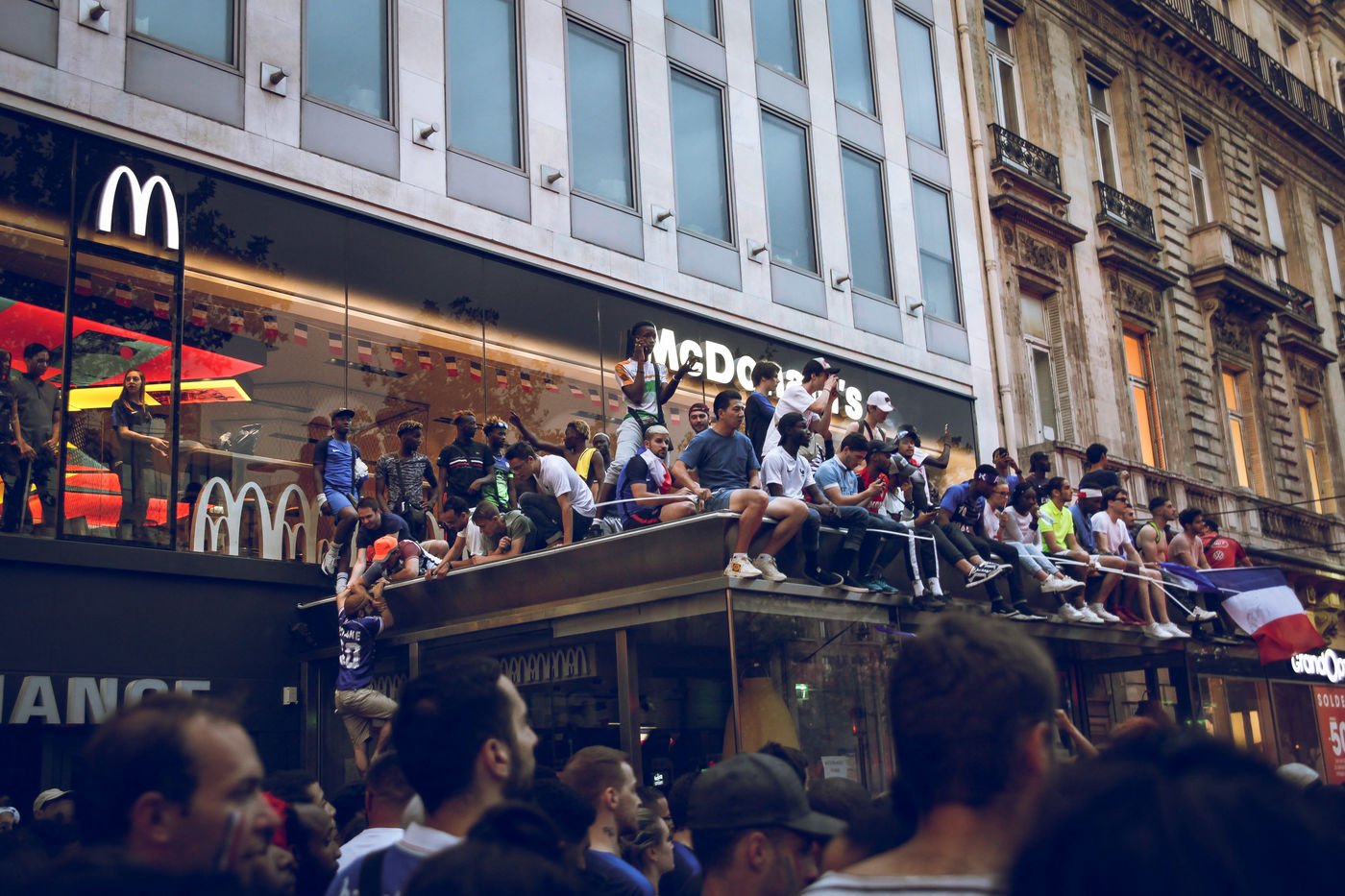 Paris, le 15 Juillet 2018. Des milliers de supporters sont rassemblés pour regarder la finale de la Coupe du Monde de football. La France remporte le trophée pour la deuxième fois de son histoire, ses supporters exultent. S'en suivent des scènes de liesses à Paris.