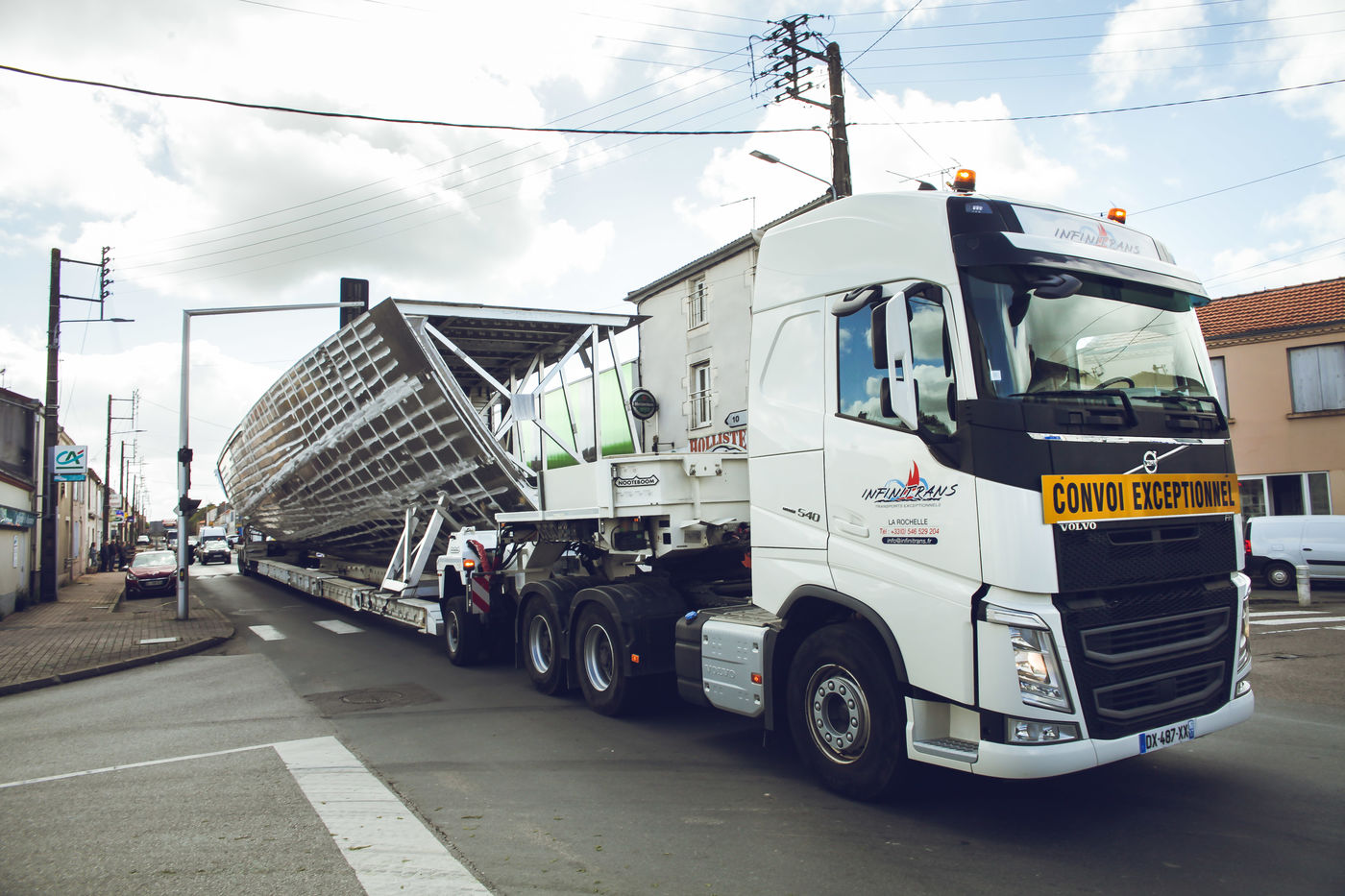 Le 16 avril 2019 en Vendée (85). Parti des chantiers Océa de Fontenay-le-Comte, un convoi exceptionnel transportant de demi-coques d'un navire, réparties sur deux camions chemine jusqu?aux Sables-d?Olonne. Ici, une partie du trajet entre Luçon et Sainte-Flaive-des-Loups.