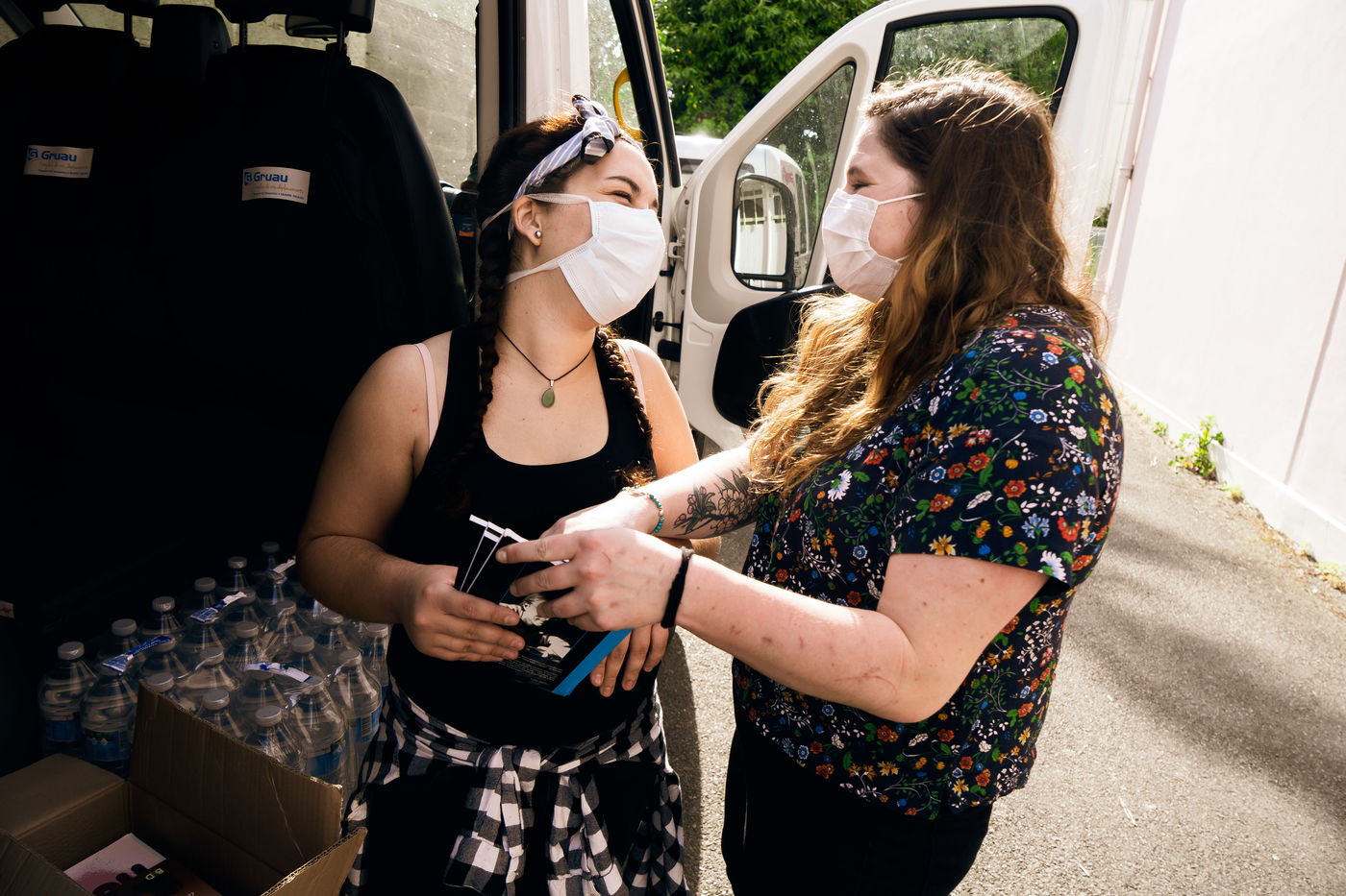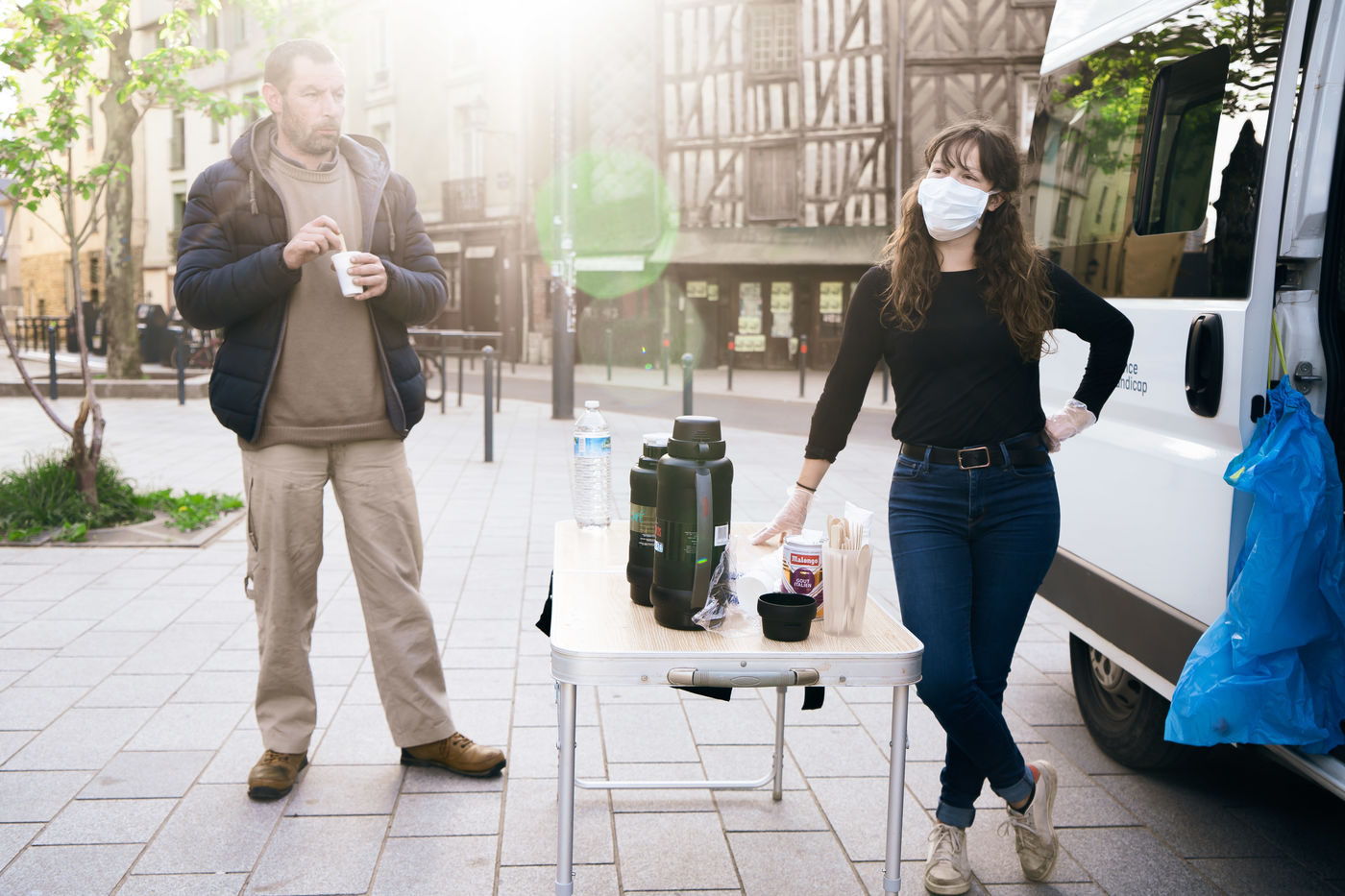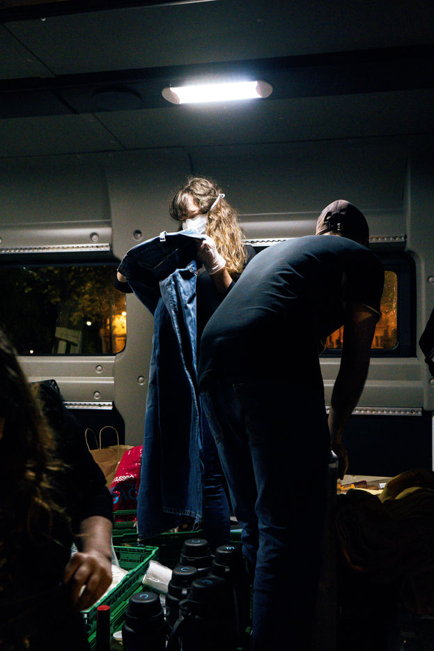 Since the beginning of the confinement on 17 March 2020, the Rennes branch of the Utopia 56 association has been touring the city of Rennes three times a week to bring food aid, hygiene products and company to those living on the streets. Series produced on 16 April 2020, in Rennes.
