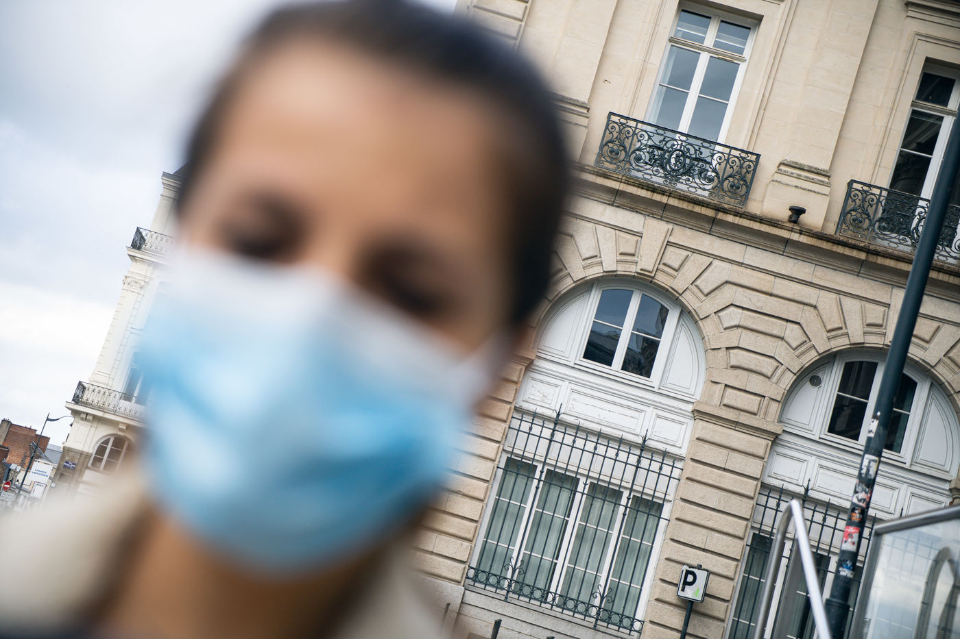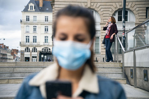 Illustration de la vie quotidienne en temps de déconfinement : traçage par applications sur smartphone, gestes barrières, ou encore grands magasins fermés. A Rennes, avril 2020.
