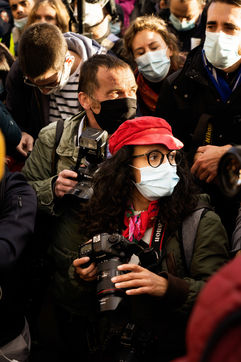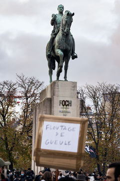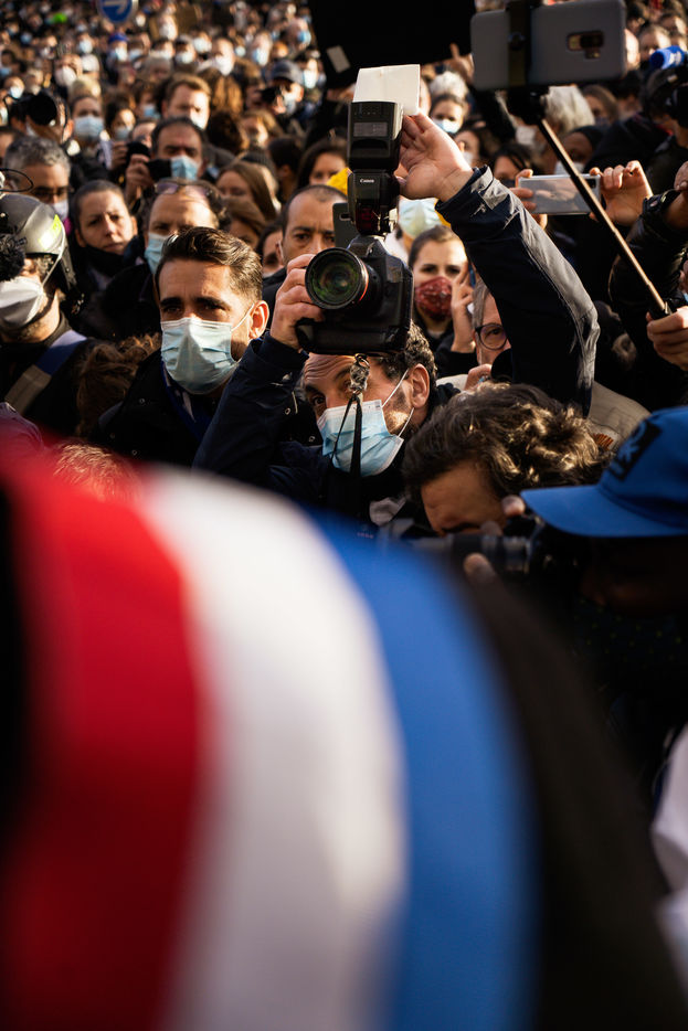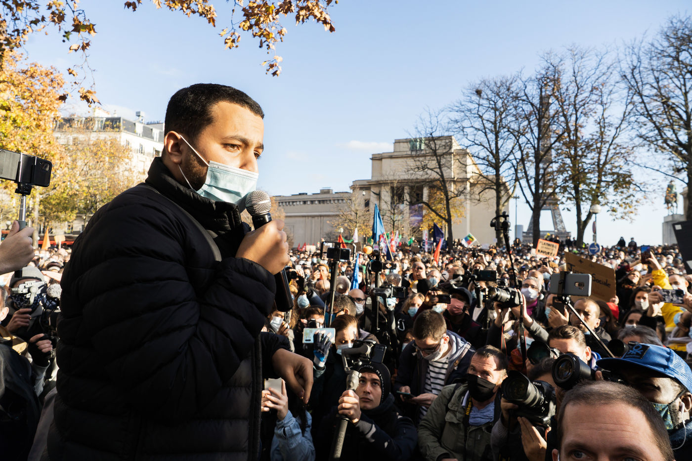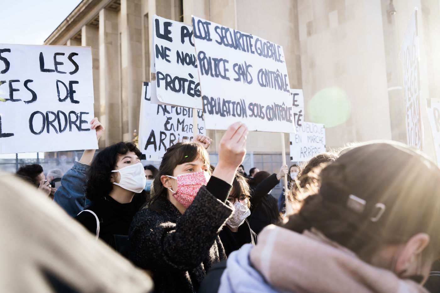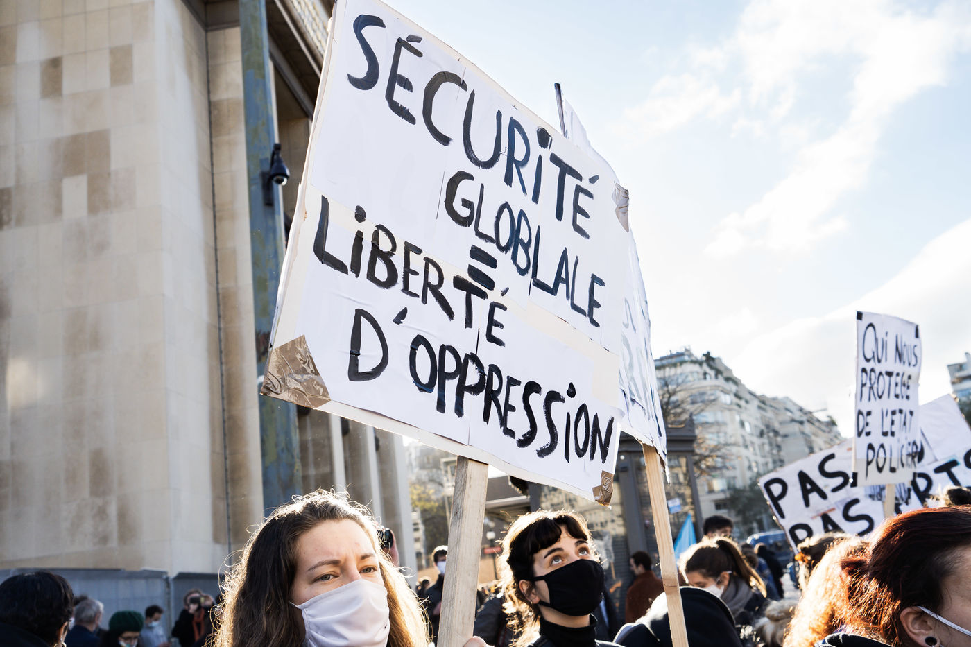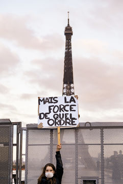 Plusieurs milliers de personnes ont manifesté sur le parvis des droits de l'homme au Trocadéro, à Paris, le samedi 21 novembre 2020 afin de protester contre le projet de loi dit "Sécurité globale".