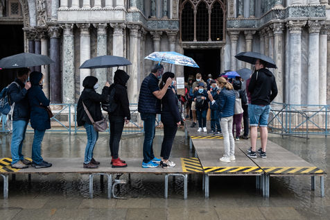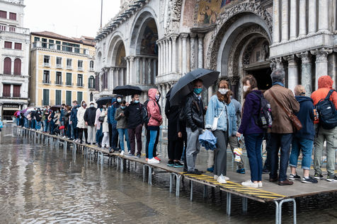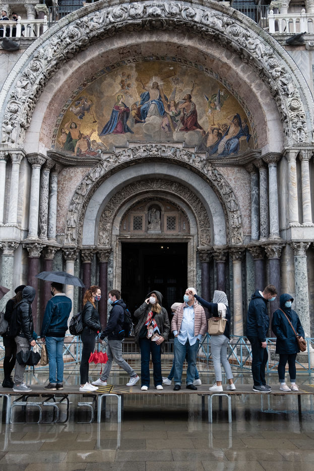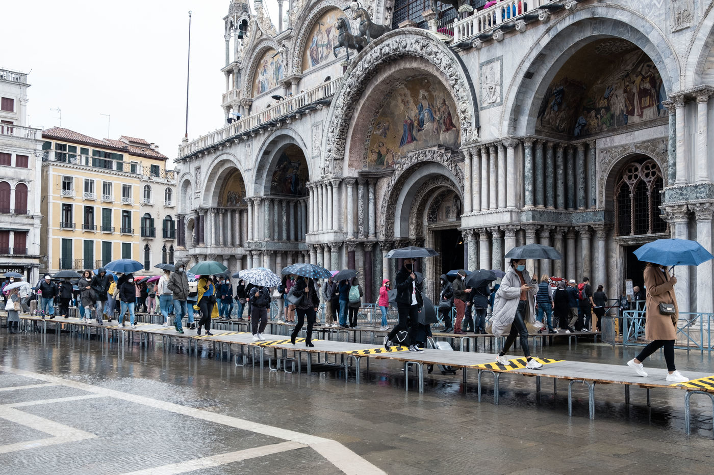 A Venise le 27 septembre 2020, sur la marée haute place saint pierre, l'eau monte. Une acqua alta sans graves conséquences mais qui rappel le danger auquel est soumis Venise. Les coefficients de marées de ce 27 septembre n'étaient pas particulièrement élevés, pourtant la place était innondée.