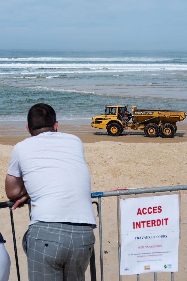 France, Landes, Biscarrosse, 18/05/2022, lors de la marée descendante, des camions et engins réaprovisionnent du sable prélevé au Sud, afin de protéger les infrastructures de la plage centrale au vu de la saison touristique. La municipalité n'a que cette solution face à l'érosion des dunes et la montée des oceans qui ne cesse de gagner du terrain sur cette station balneaire.