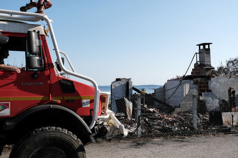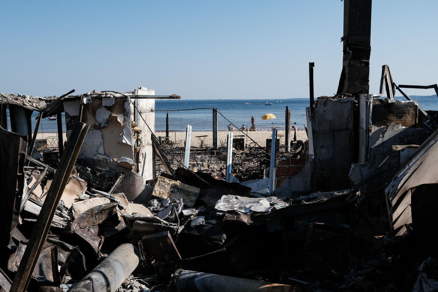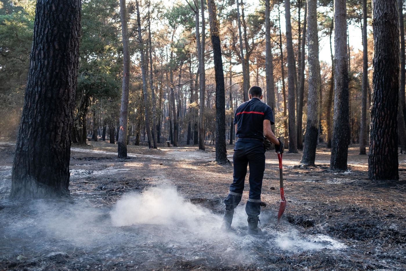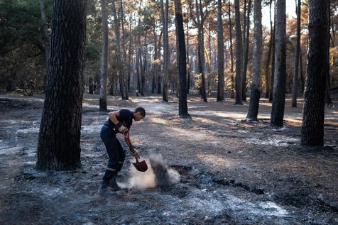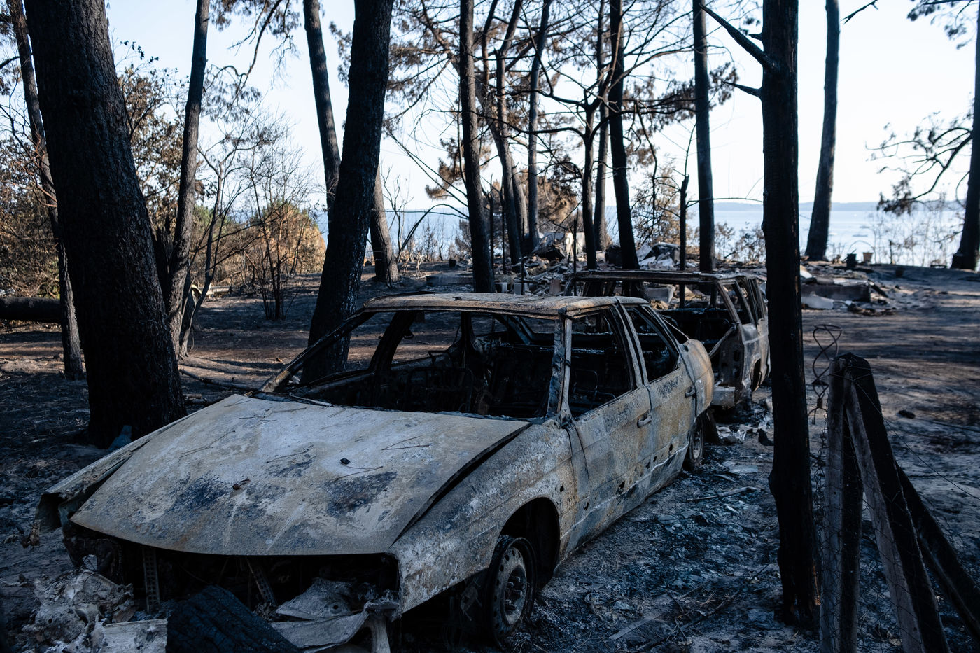 In Cazaux, in Gironde, on July 24, 2022, after the passage of the fire of La Teste de Buche. This one is now fixed and the inhabitants could return to their homes. The firemen are still working, because the fire is in suspense, in the ground. A restaurant, cars and some buildings were destroyed by the flames.