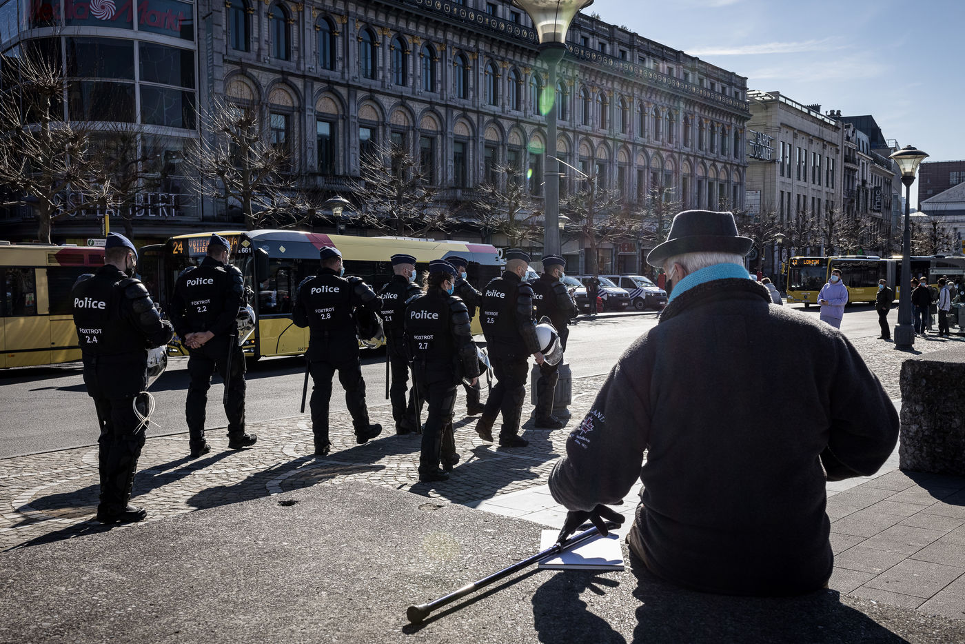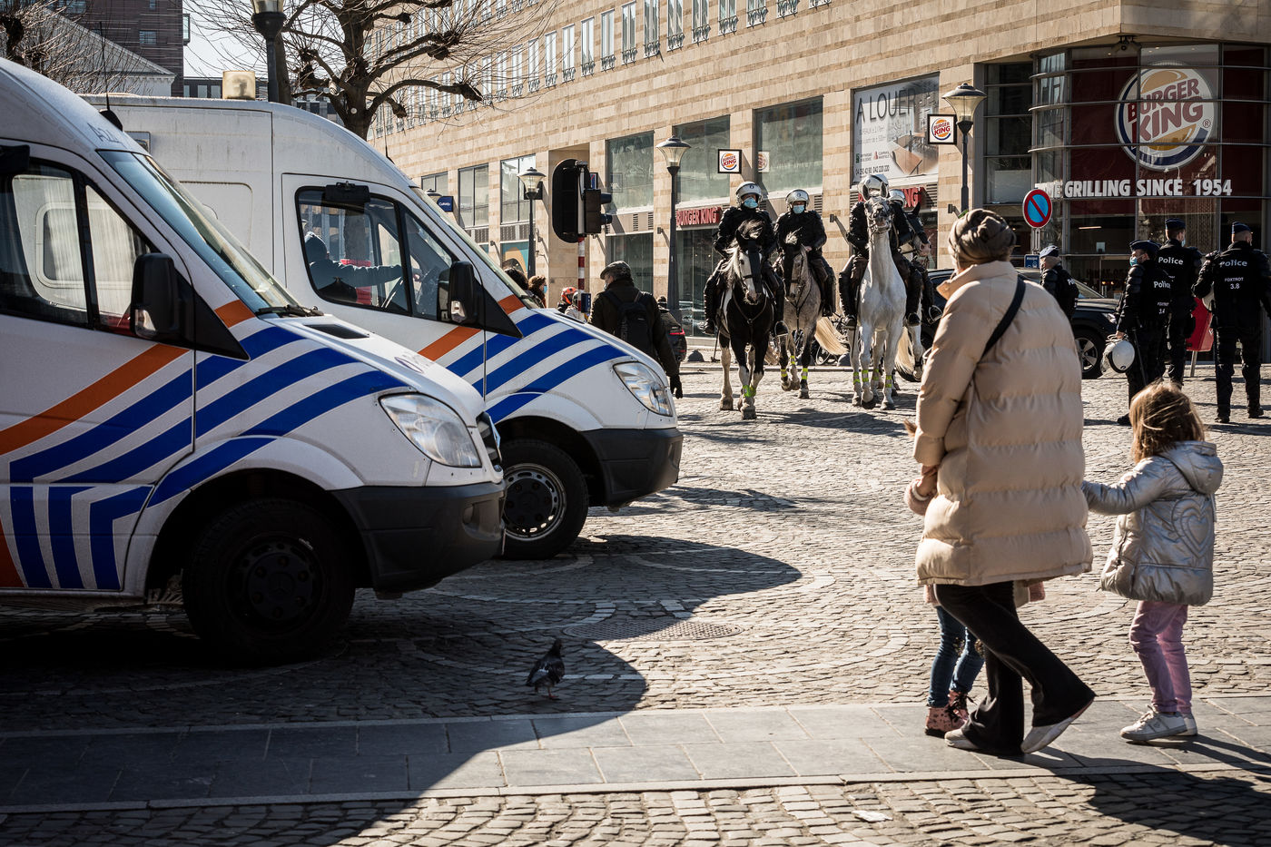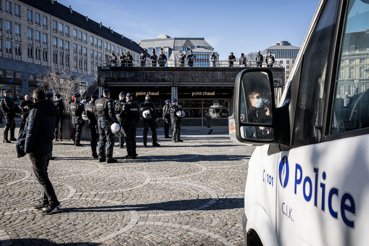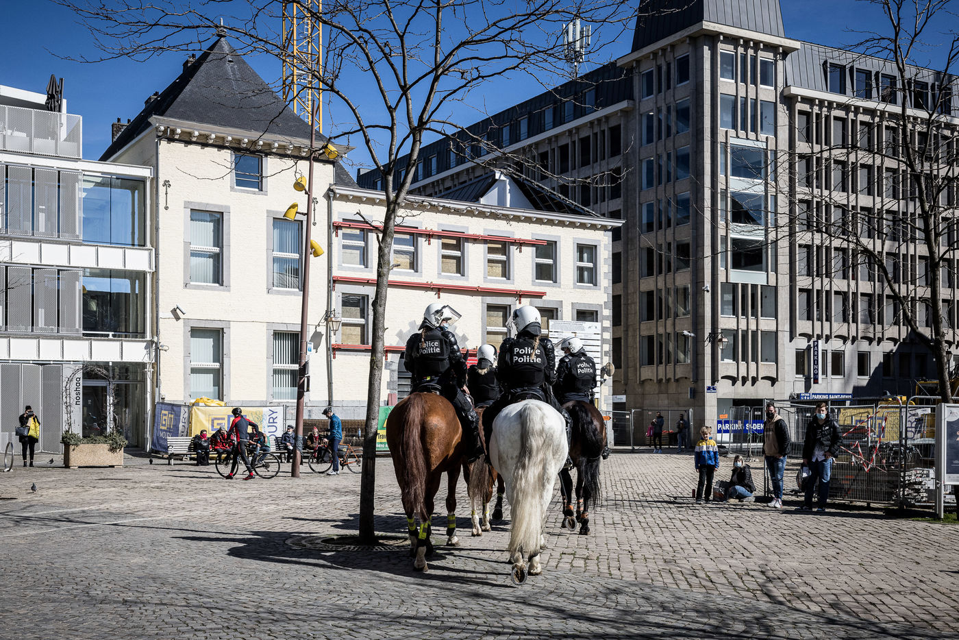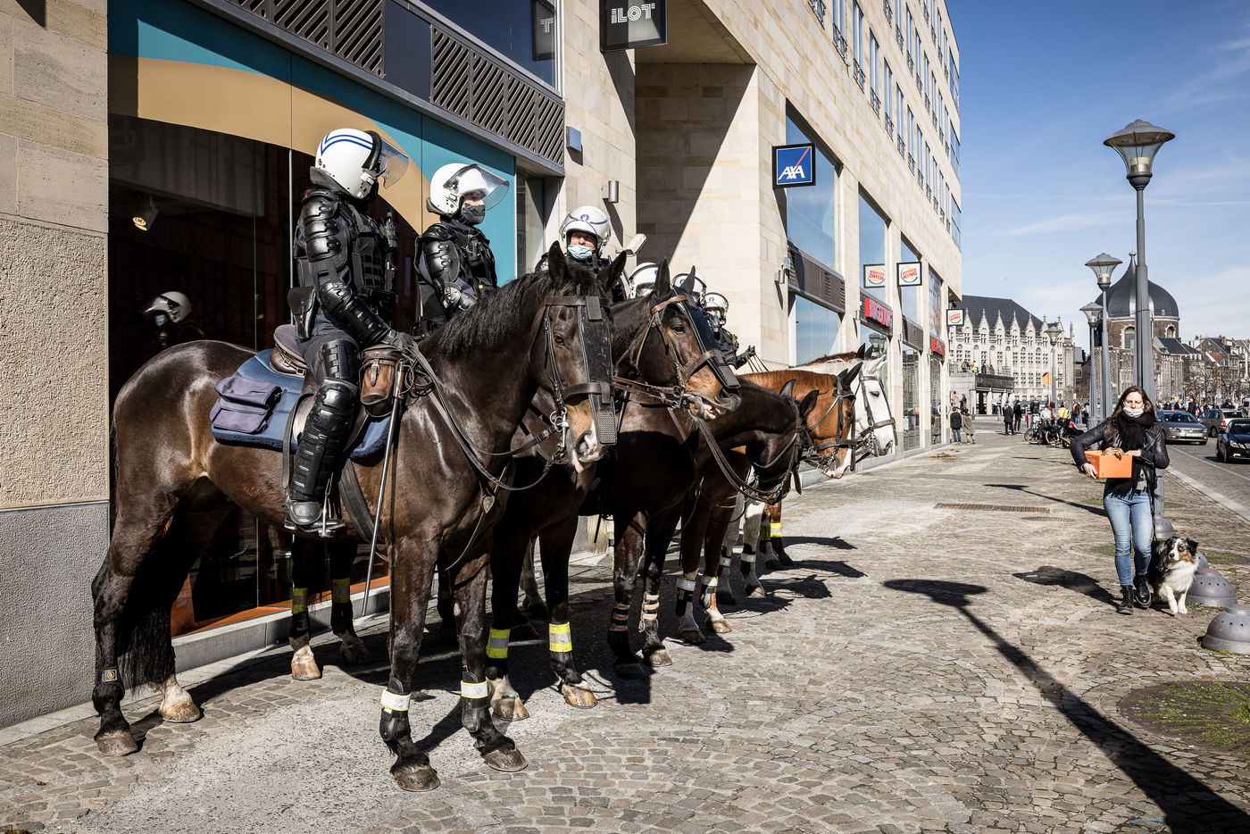 Liege, Belgium. March 20th, 2021. Following the violent riots of March 13 on the Place Saint-Lambert, the Police is deployed in large numbers in the city center of Liege in order to dissuade the rioters from trying to reproduce last week's scenario.