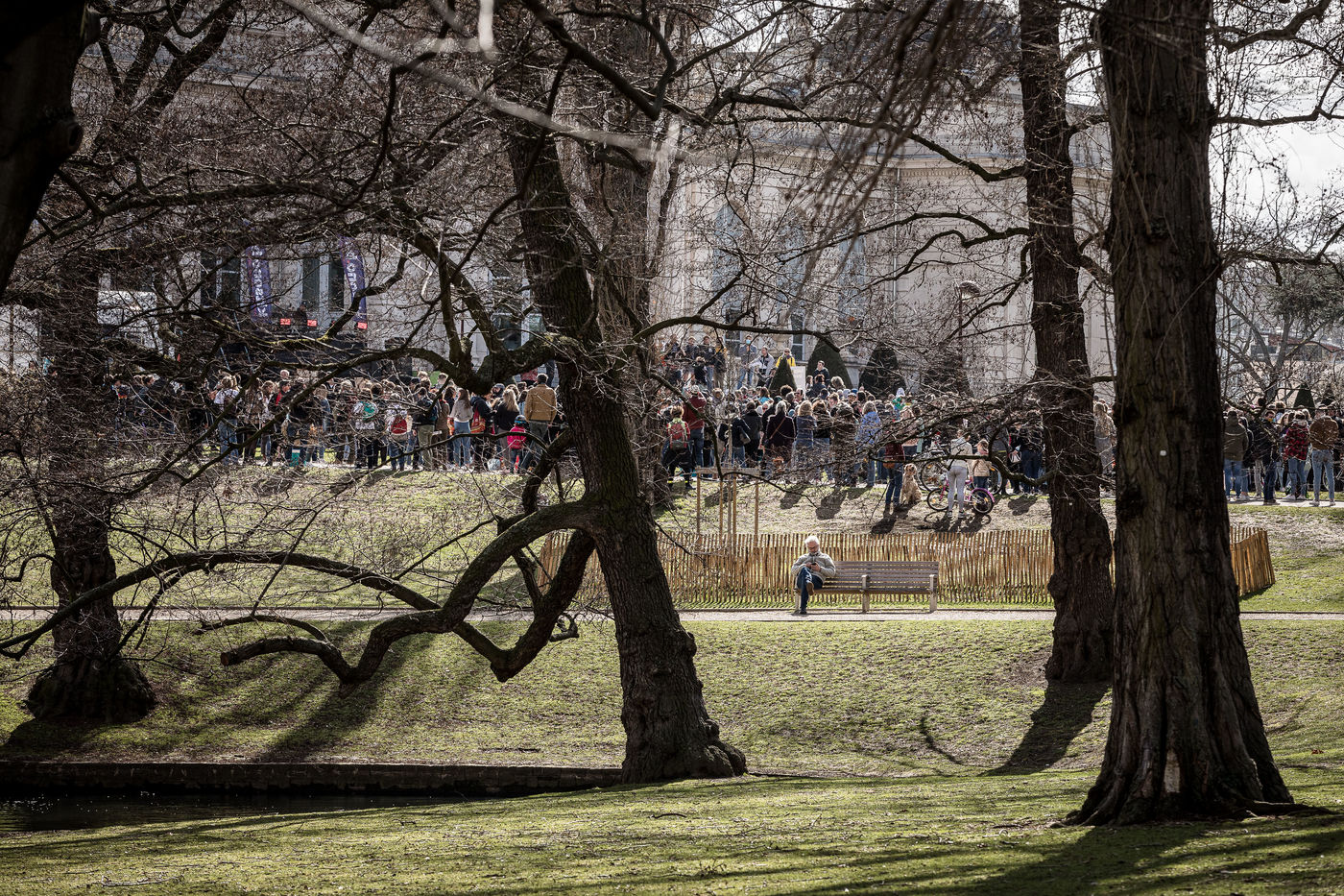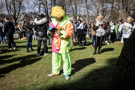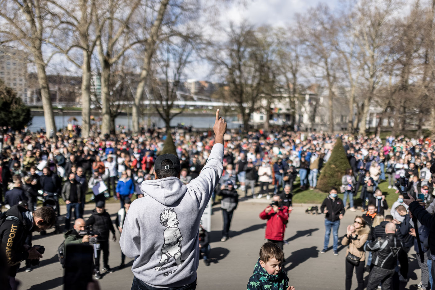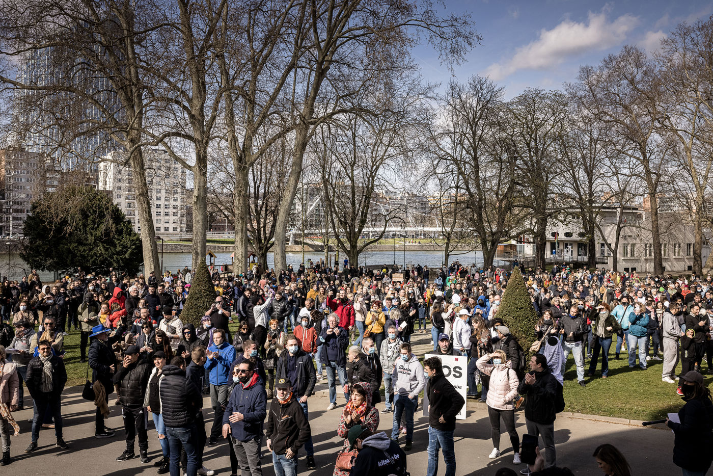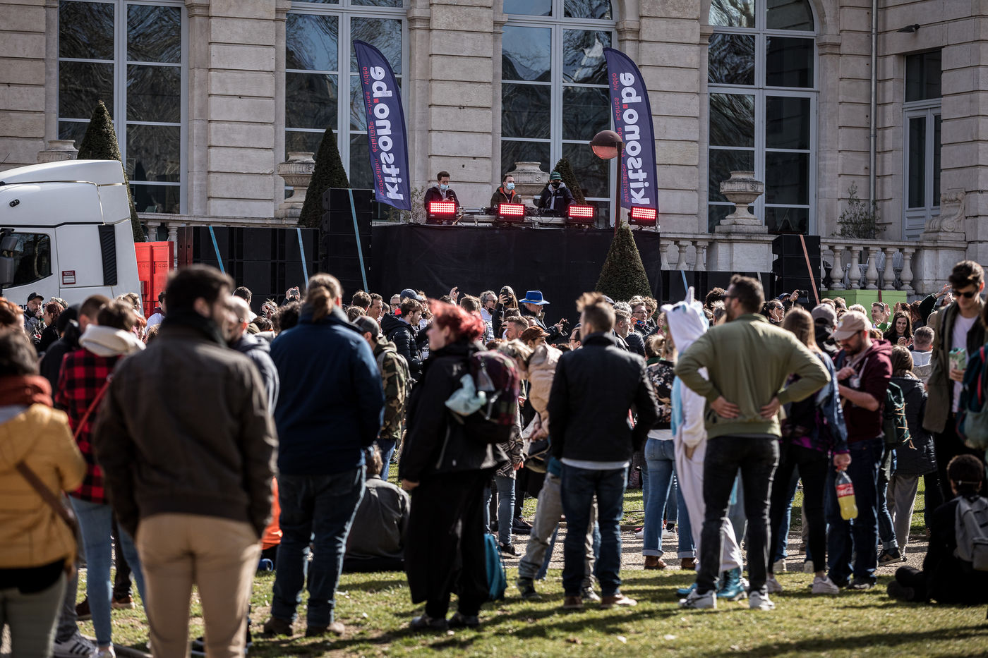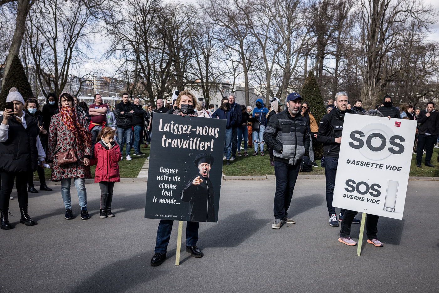 Liege, Belgique. 28 Mars 2021. Plusieurs centaines de personnes rassemblees au Parc de la Boverie afin de contester les nouvelles mesures anti-covid decidees par le gouvernement. Il s agit d un evenement repris sous un front commun de plusieurs associations dont de nombreux representants de l horeca.
