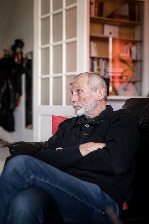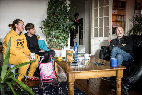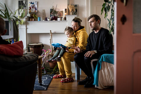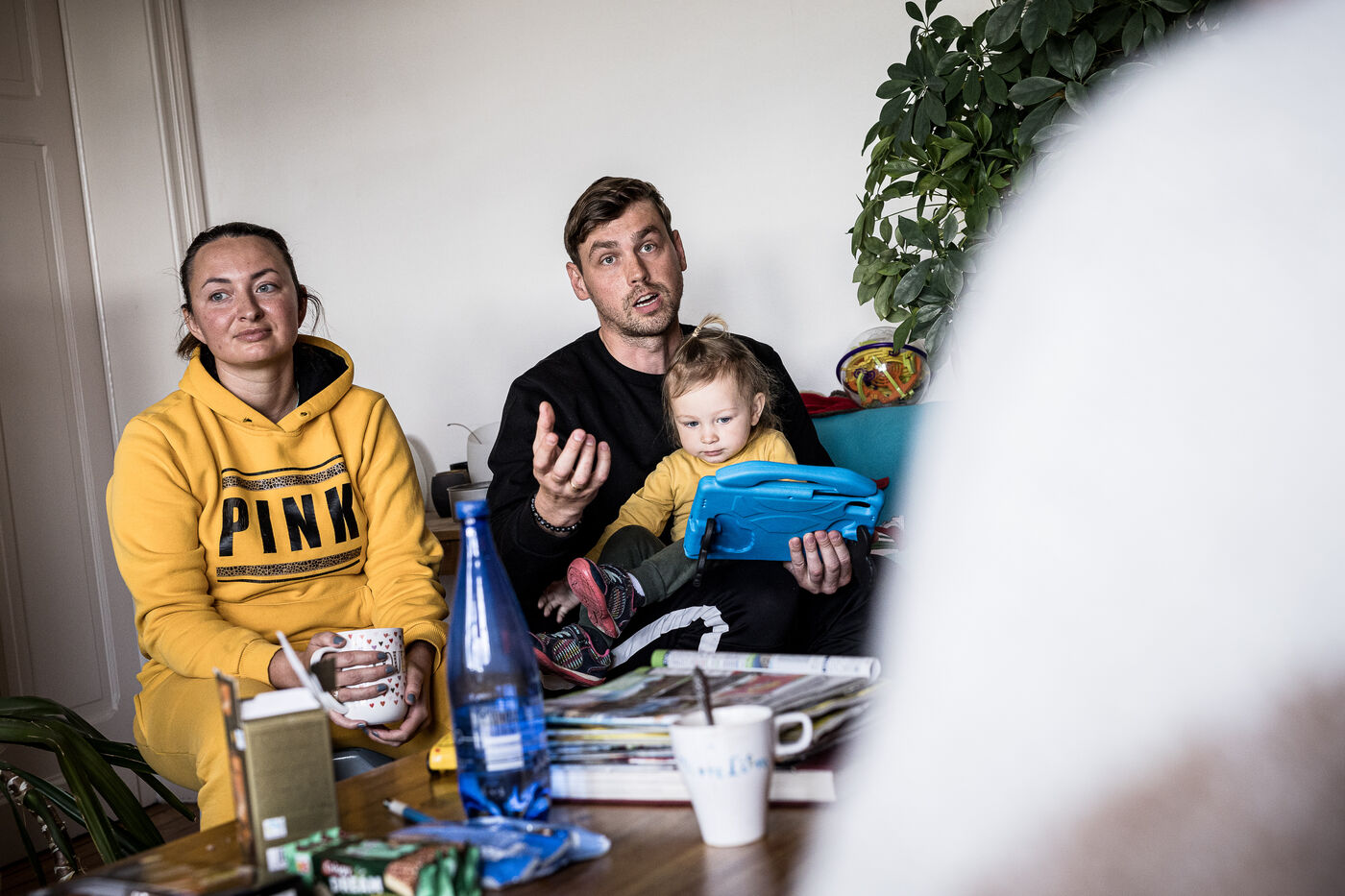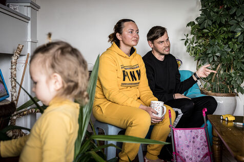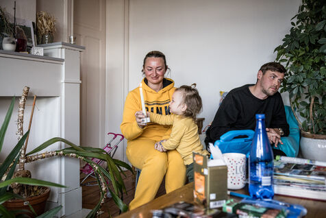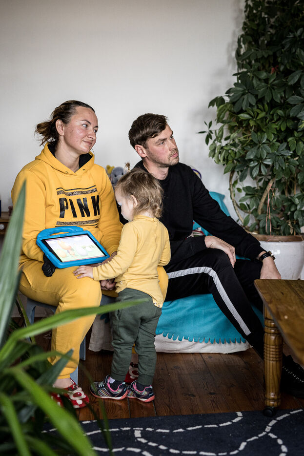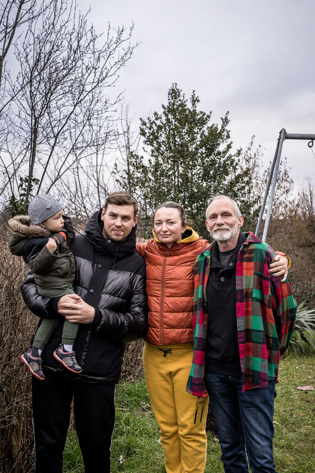 Namur, Belgium. 2023-02-17. Portrait of Anna, Volodymir and their son Ioann. A few weeks after the beginning of the war in Ukraine, they were welcomed in the house of Stephane Janne. Volodymir could even bring his parents a few months later.