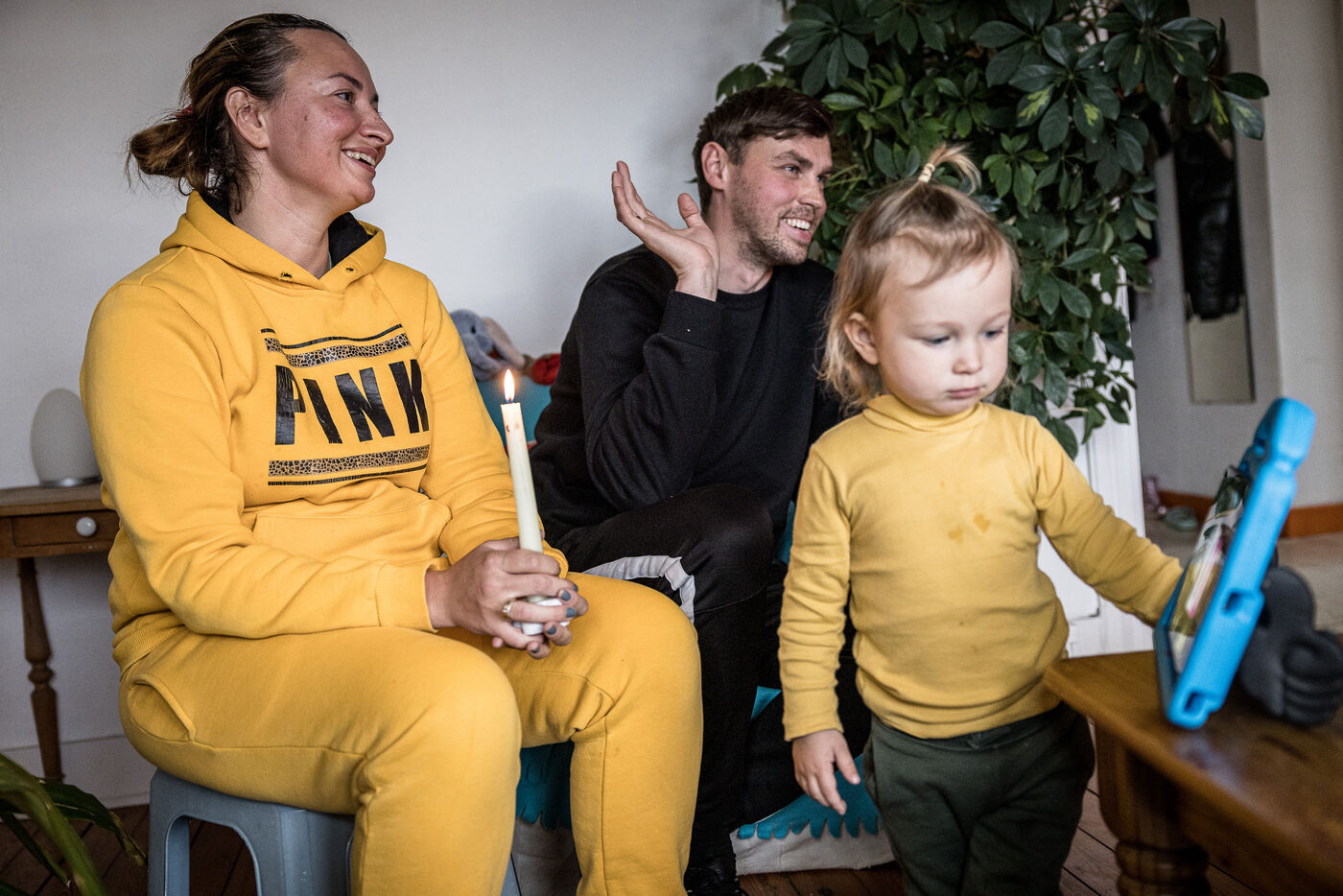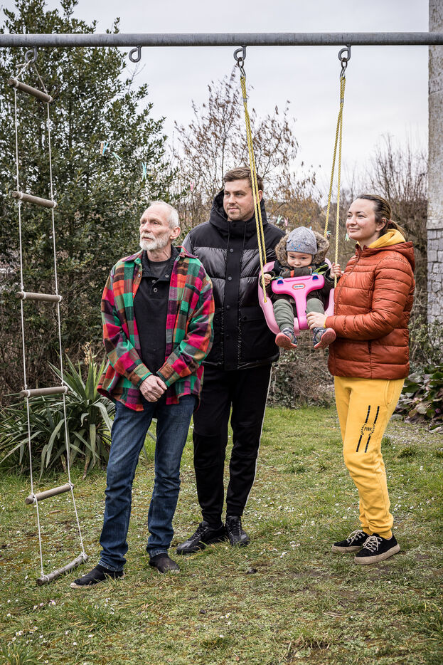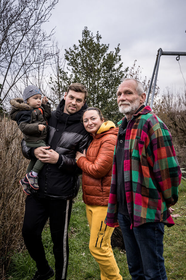 Namur, Belgique. 2023-02-17. Portrait d Anna, Volodymir et leur fils Ioann. Quelques semaines apres le debut de la guerre en Ukraine, ils ont ete accueilli dans la maison de Stephane Janne. Volodymir a meme pu faire venir ses parents quelques mois plus tard.