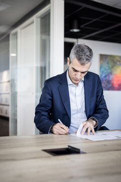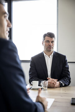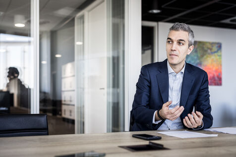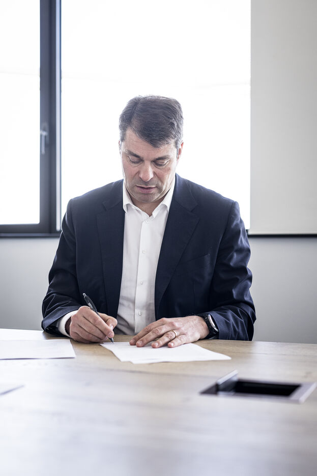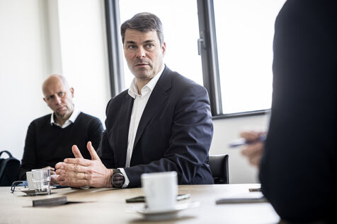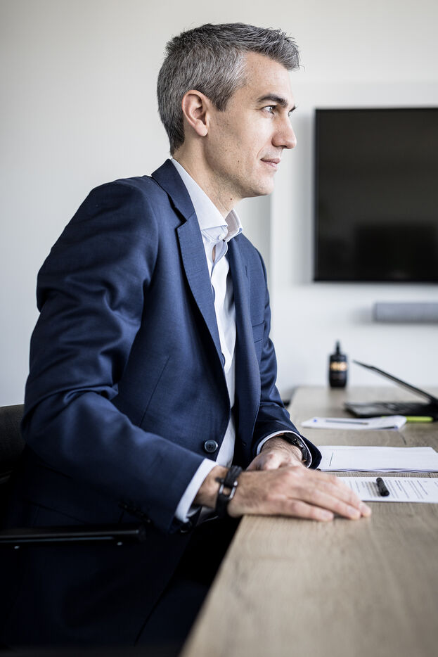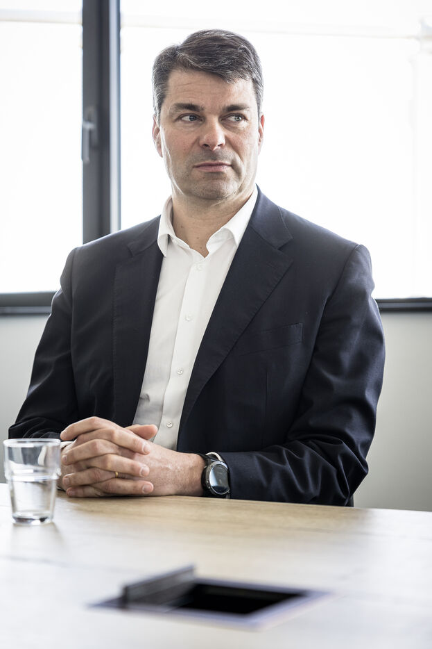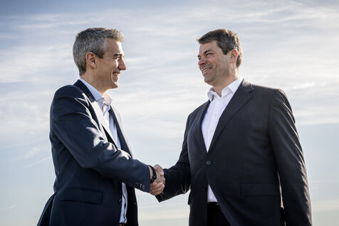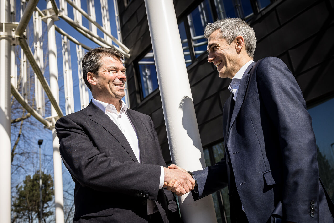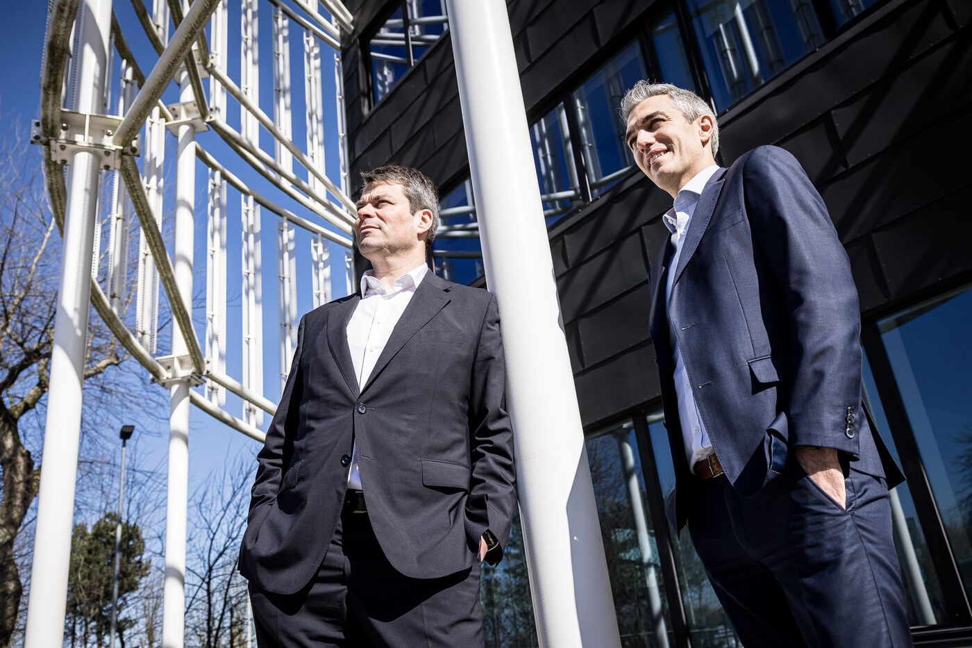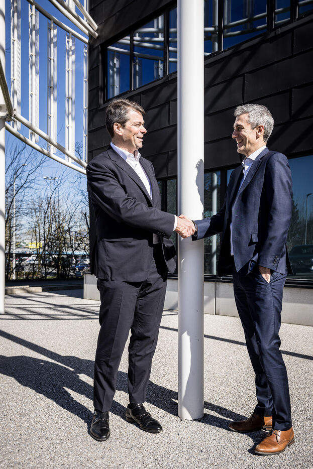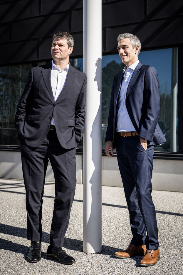 Gosselies, Belgium. 2023-04-04. Portrait of Yves Delatte, CEO of Sonaca and Stephane Burton, CEO of Orizio and Sabena Aerospace.