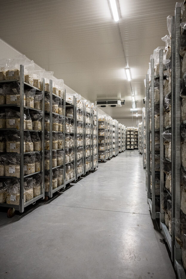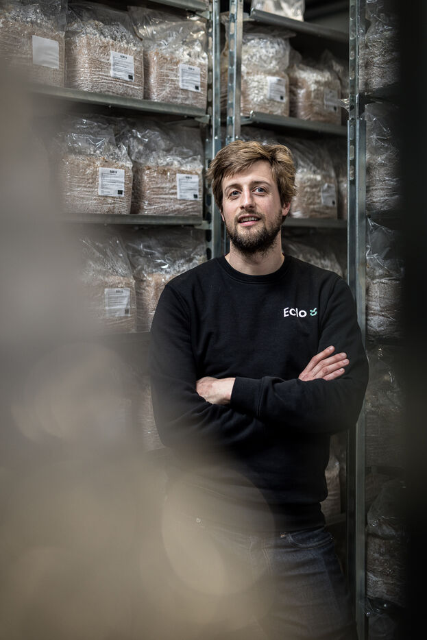 Villers-le-Bouillet, Belgique. 2023-04-24. Portrait d Hadrien Velge, CEO de l entreprise Eclo. Situee non loin de Liege, elle vient d ouvrir une usine de production de substrat pour la culture des champignons de differentes familles.