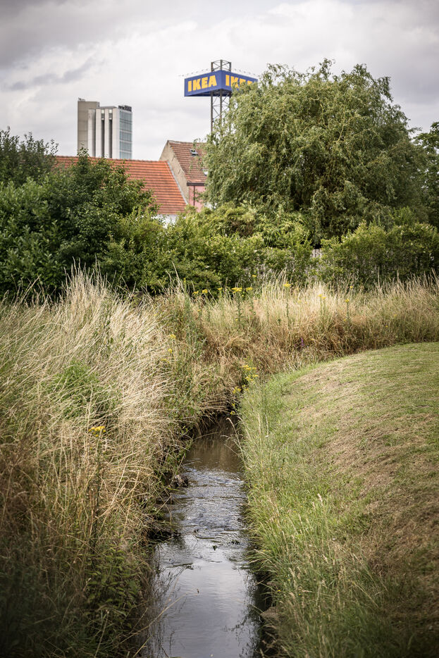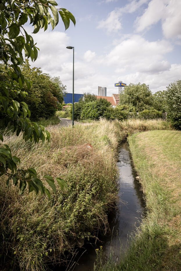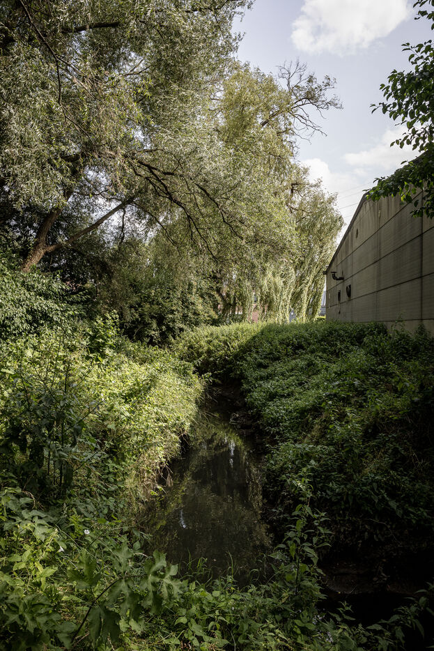 Bruxelles, Belgique. 2023-07-03. La riviere Zuunbeek coule dans le sud de Bruxelles a proximite d Anderlecht. Une petite reserve naturelle discrete a ete creee pour la proteger. Photographie de Valentin Bianchi / Hans Lucas