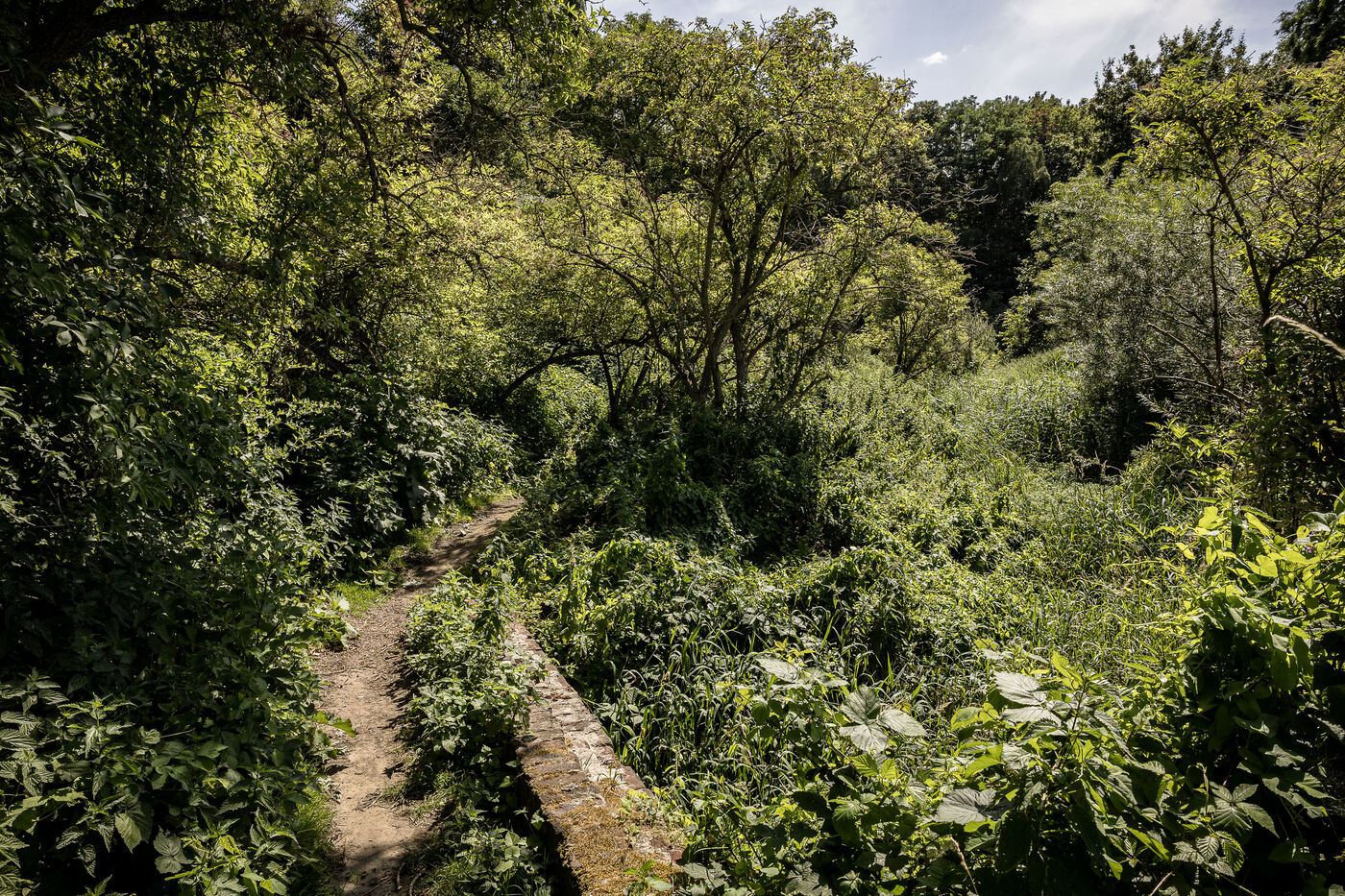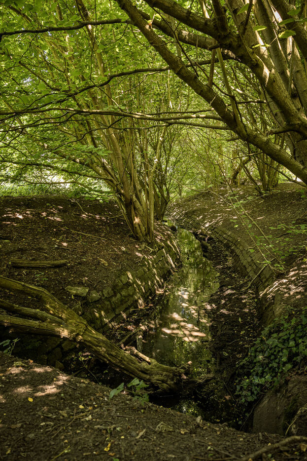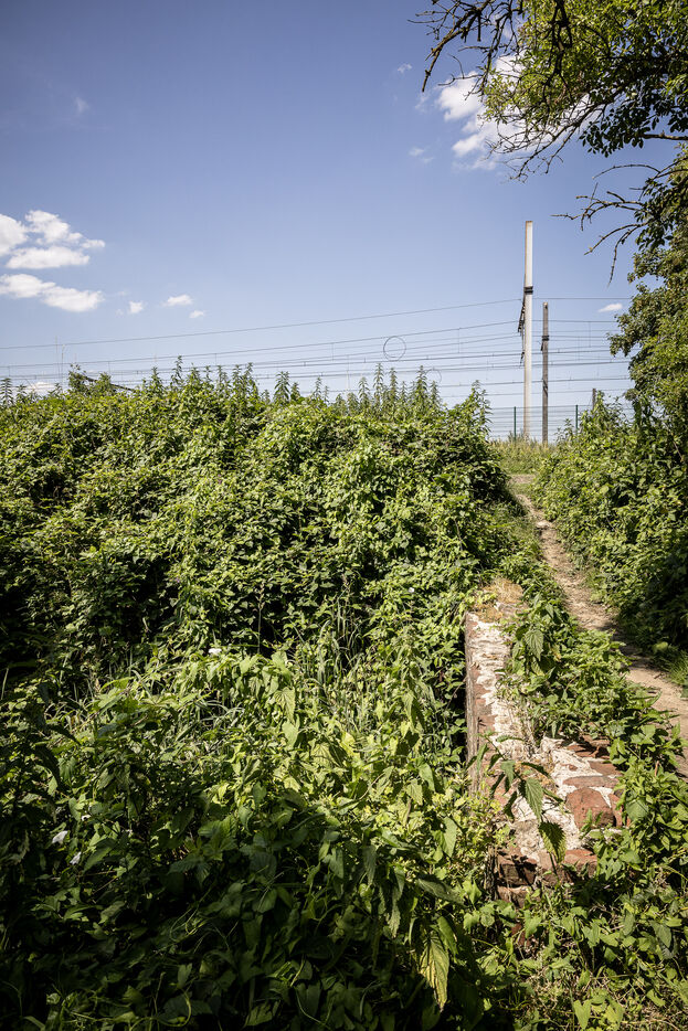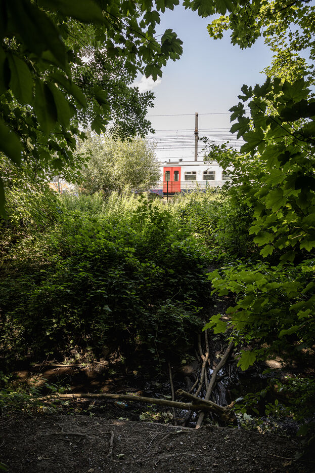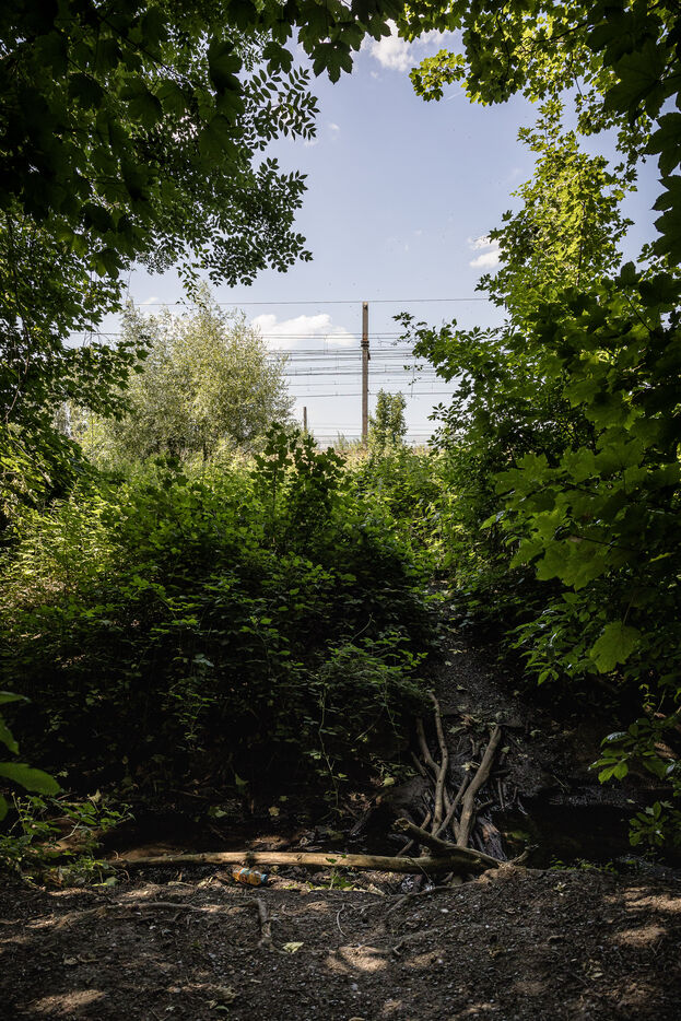 Evere, Belgique. 2023-07-07. La riviere Kerkebeek se fait discrete a proximite de la voie ferree, survolee par les avions arrivant a Zaventem, son lit se perd dans une nature luxuriante.