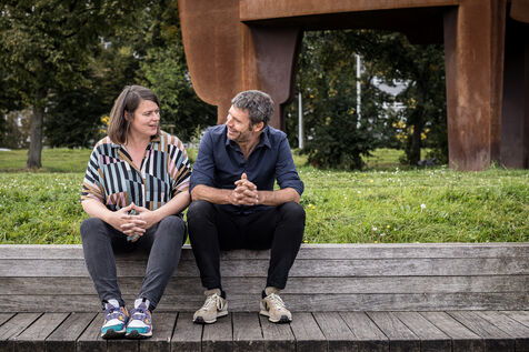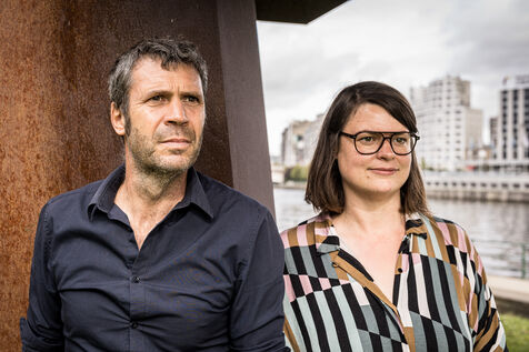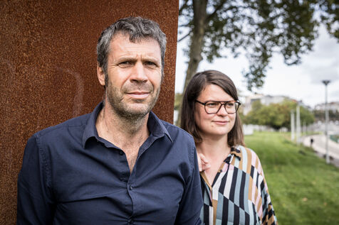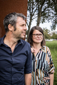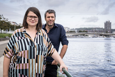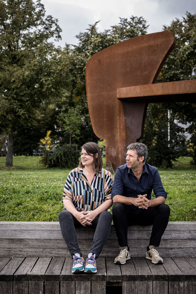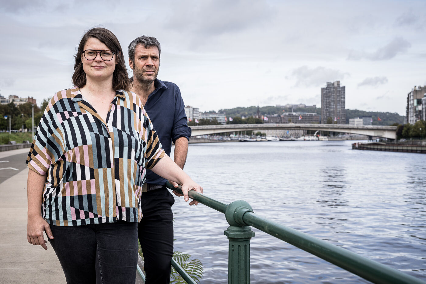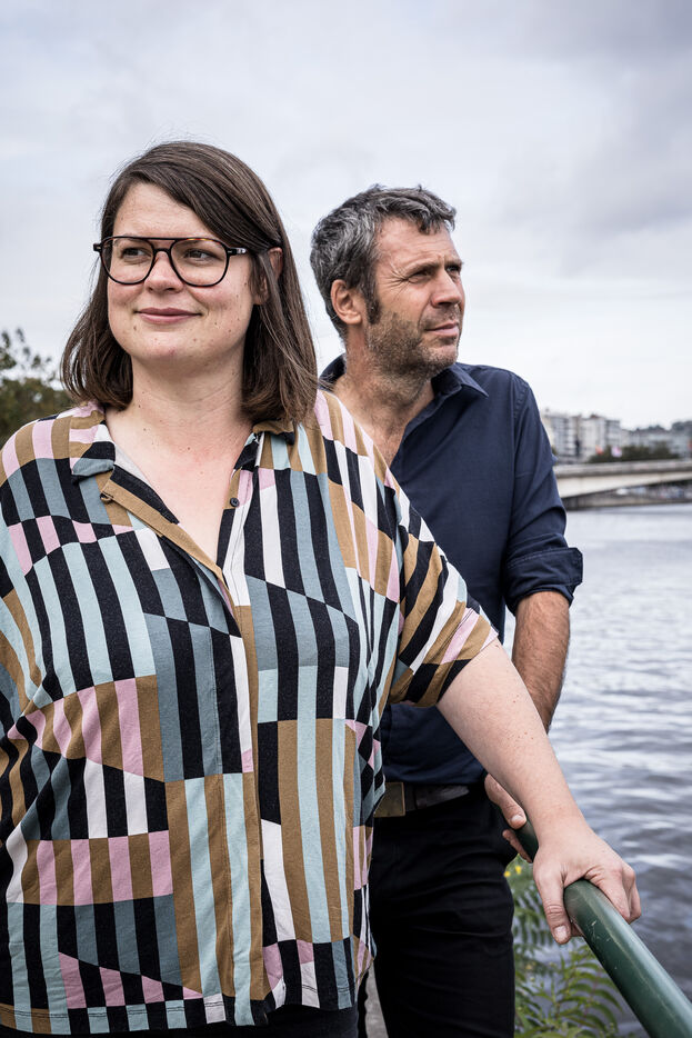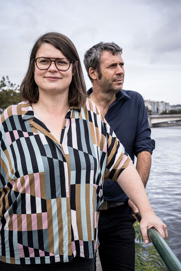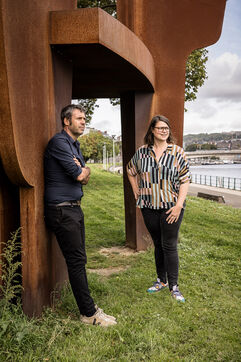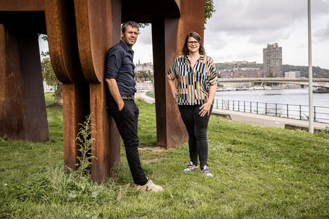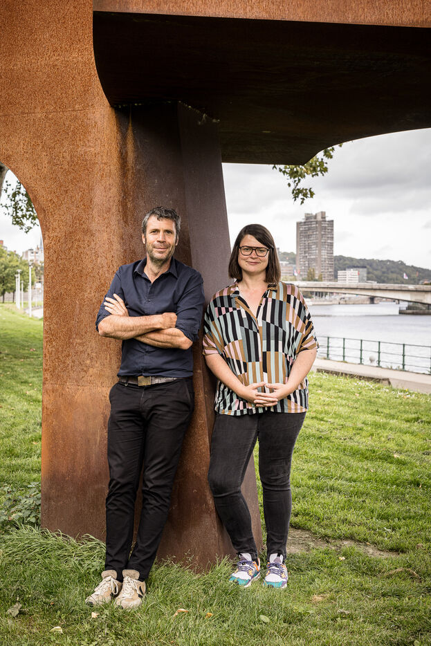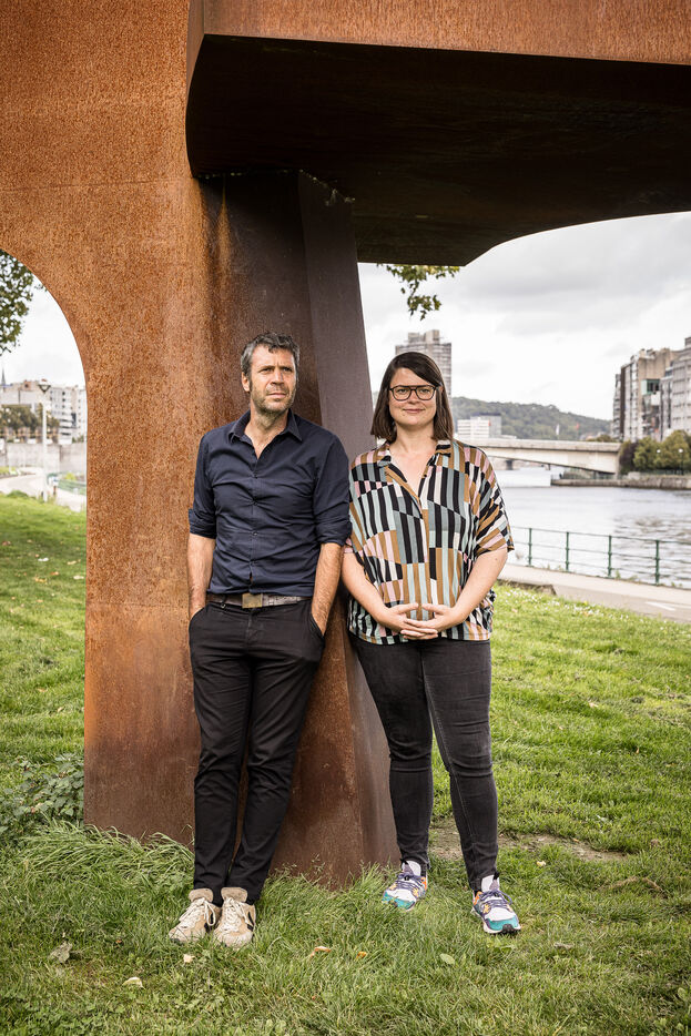 Liege, Belgium. 2023-10.05. Portrait of Sarah Jonet, Cooperative Director, and Hugues Dorzee, Editor-in-Chief of "Imagine Demain Le Monde" magazine.