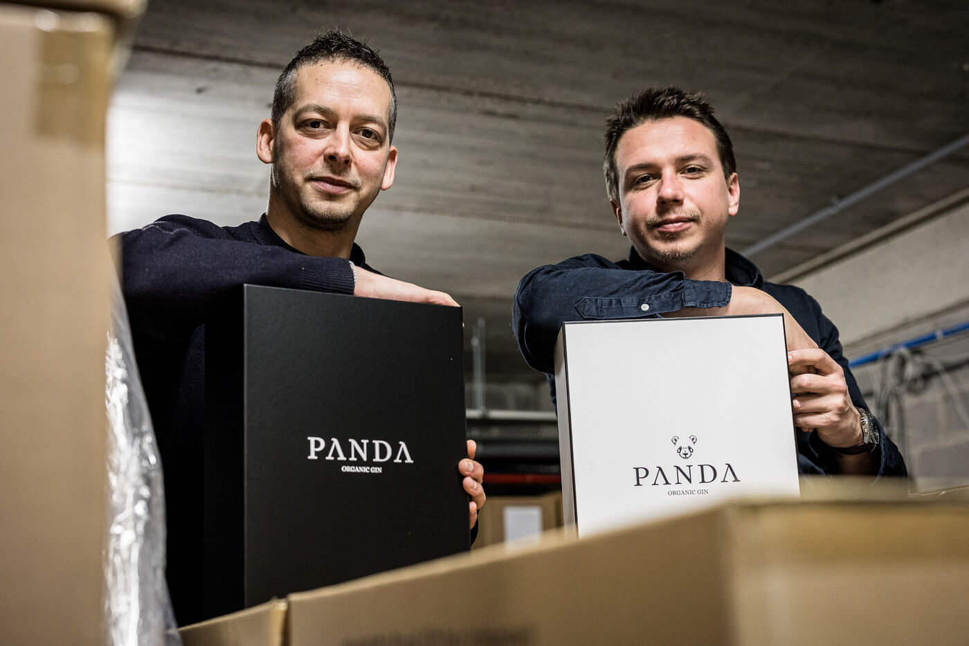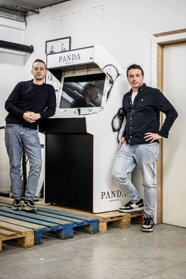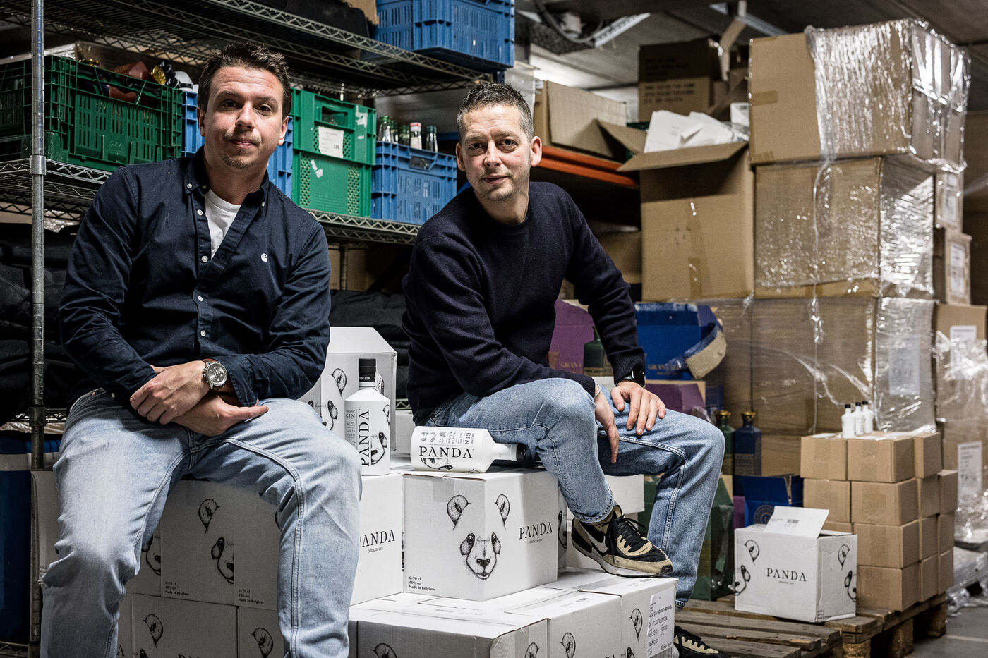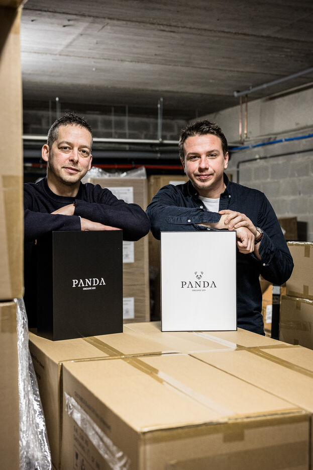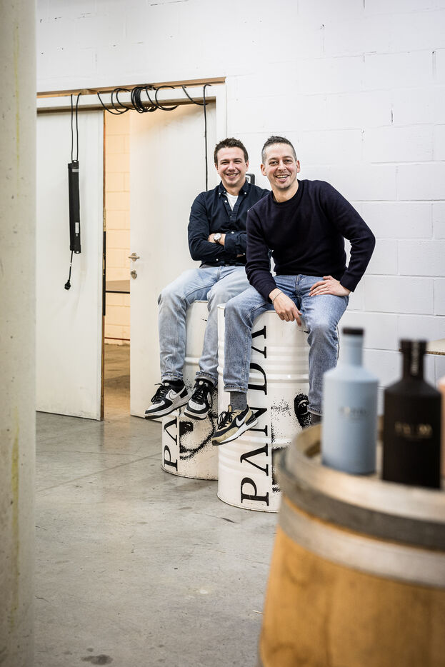 Waterloo, Belgium. 2023-12-27. Meet the co-founders of Panda Gin, Jeremy Chauvaux and Sonny Mortiaux. The company is growing and aims to develop exports as much as possible. Photograph by Valentin Bianchi / Hans Lucas