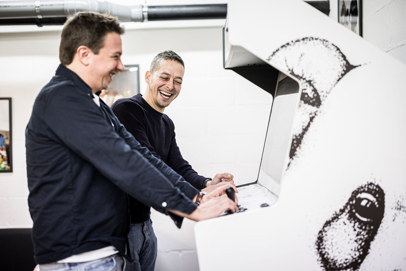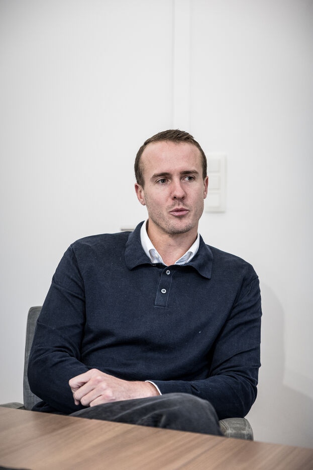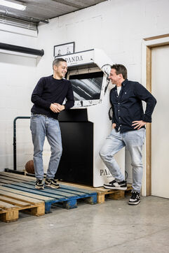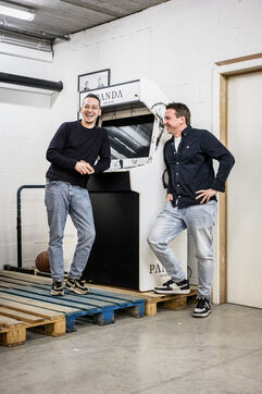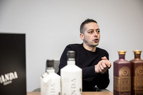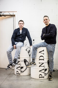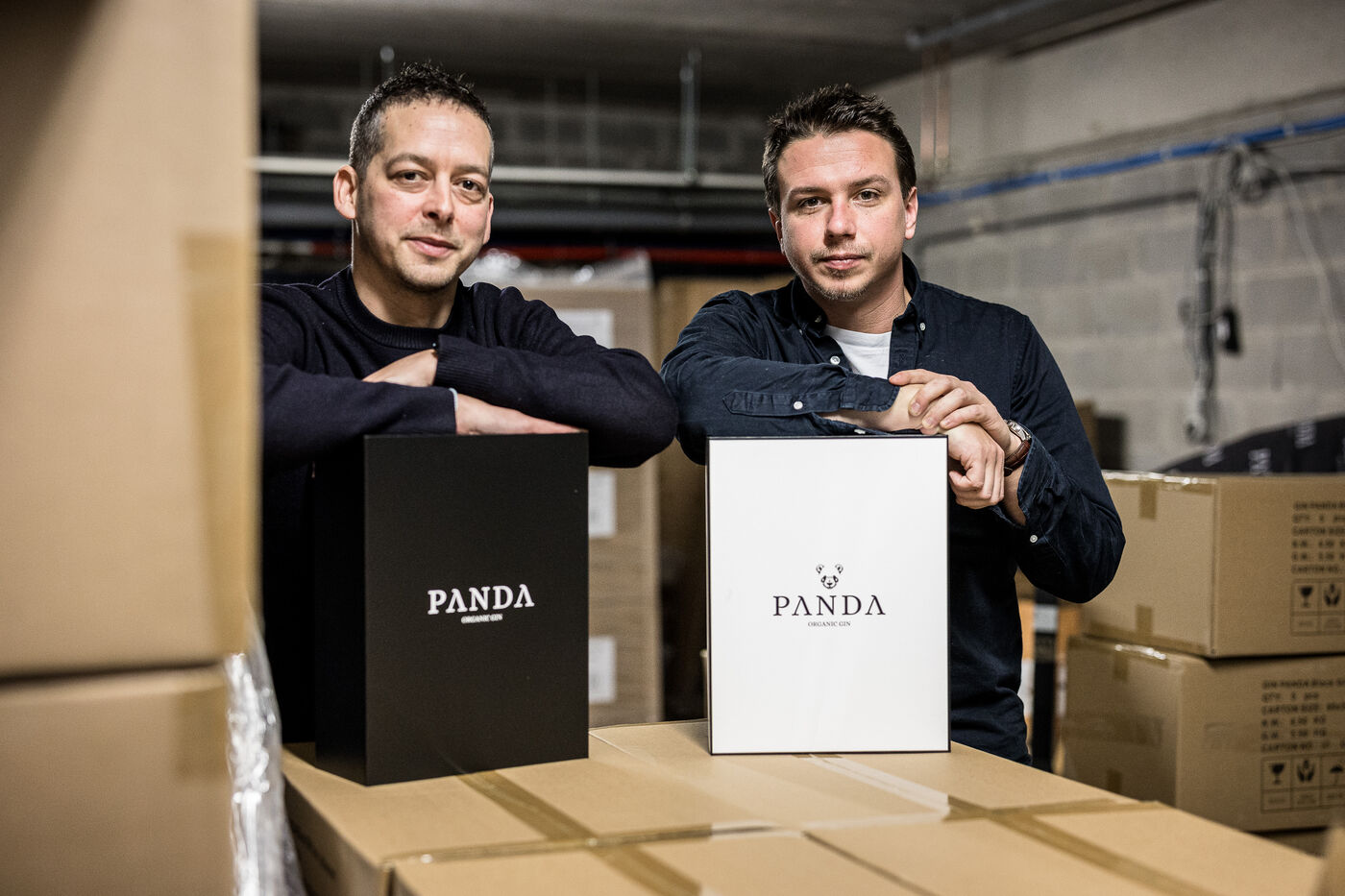 Waterloo, Belgium. 2023-12-27. Meet the co-founders of Panda Gin, Jeremy Chauvaux and Sonny Mortiaux. The company is growing and aims to develop exports as much as possible. Photograph by Valentin Bianchi / Hans Lucas