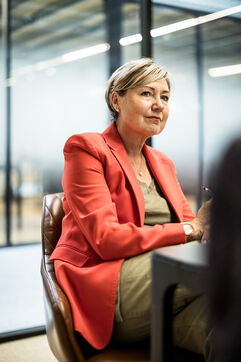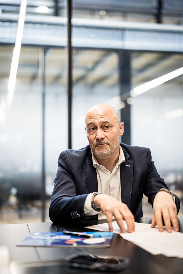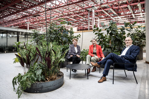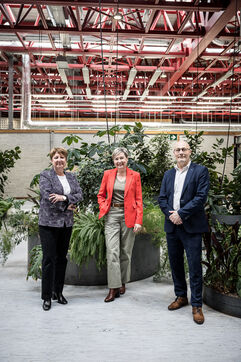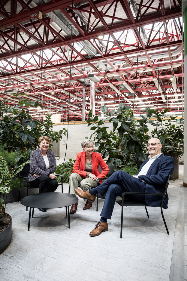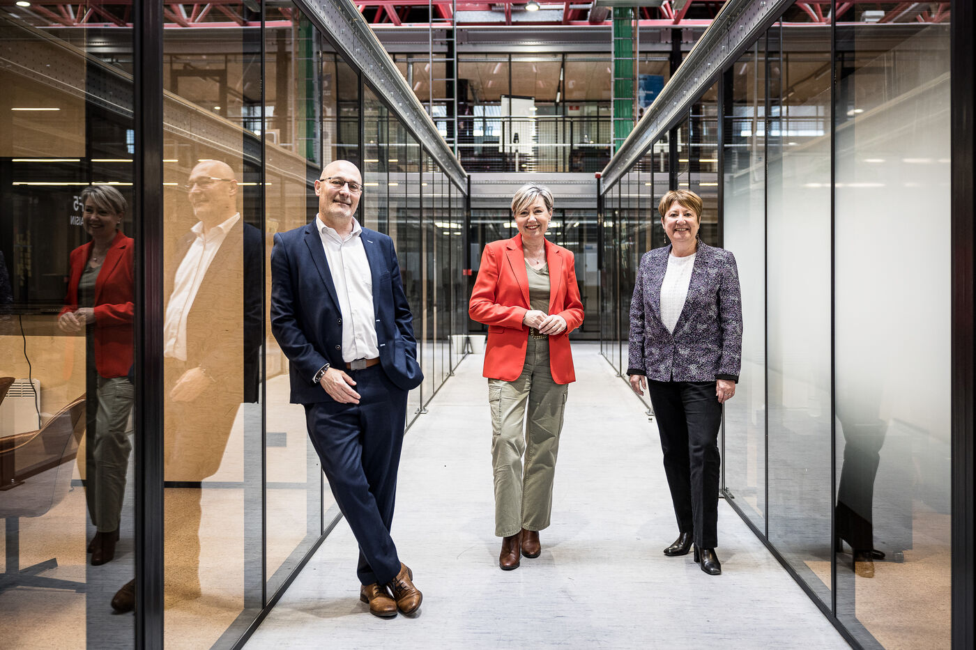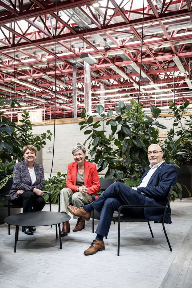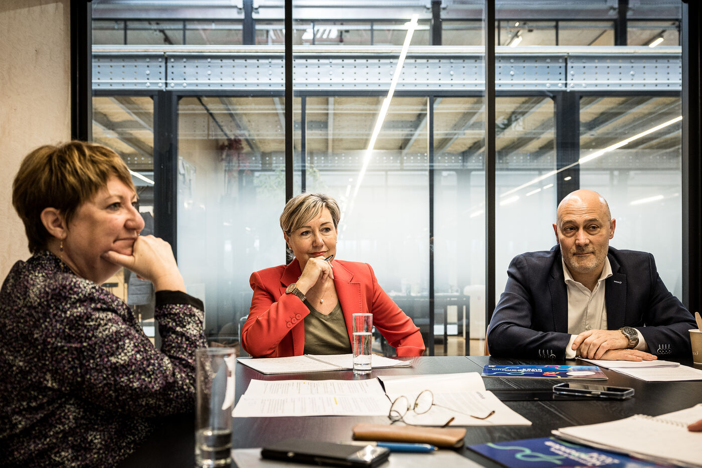 Charleroi, Belgium. 2024-04-25. Portrait of Celine Neven, CEO of UWE, Sylvie Marque, Secretary General of SPW and Lionel Bonjean, Director General of SPW Economy, Employment, Research. Photograph by Valentin Bianchi / Hans Lucas