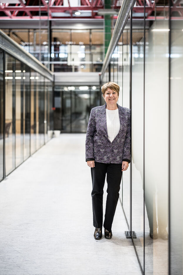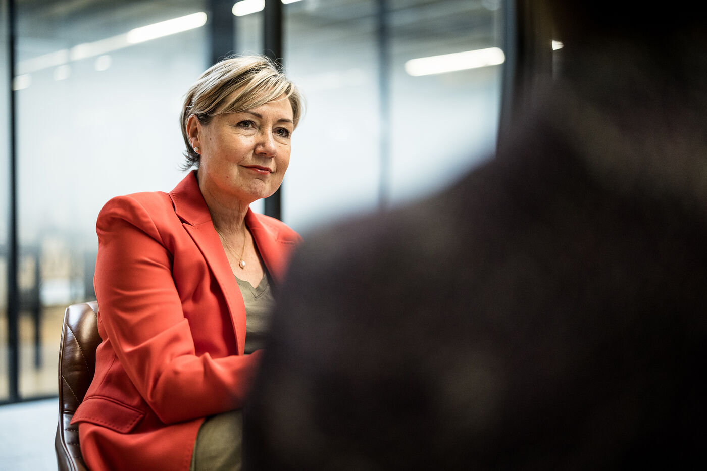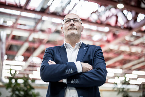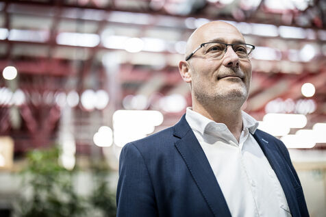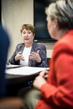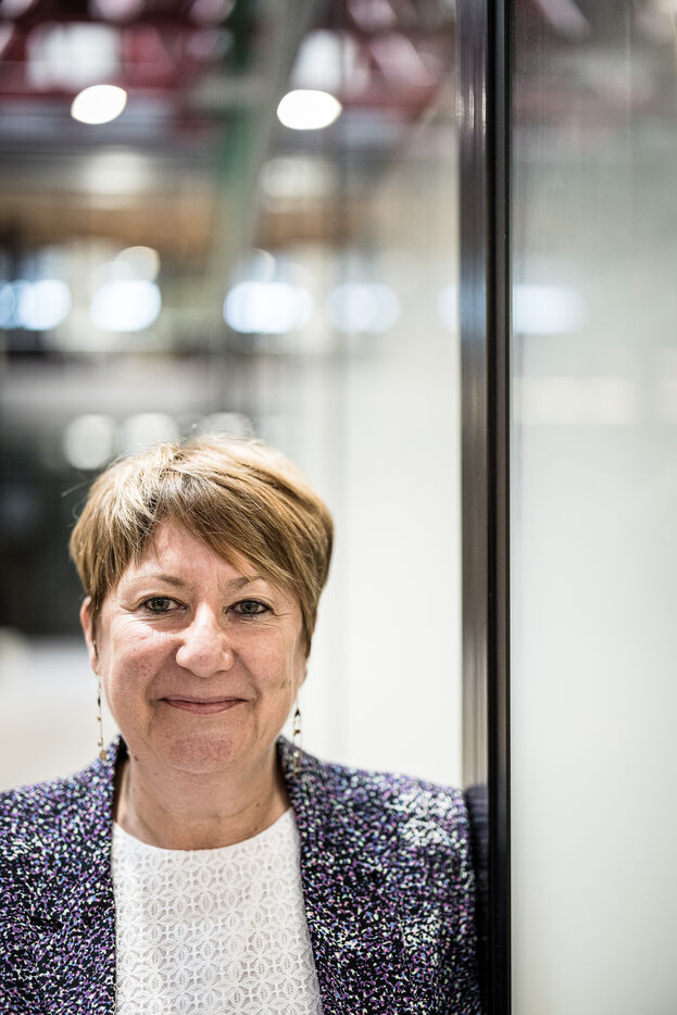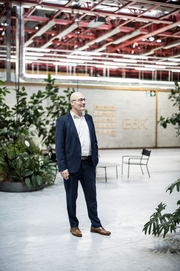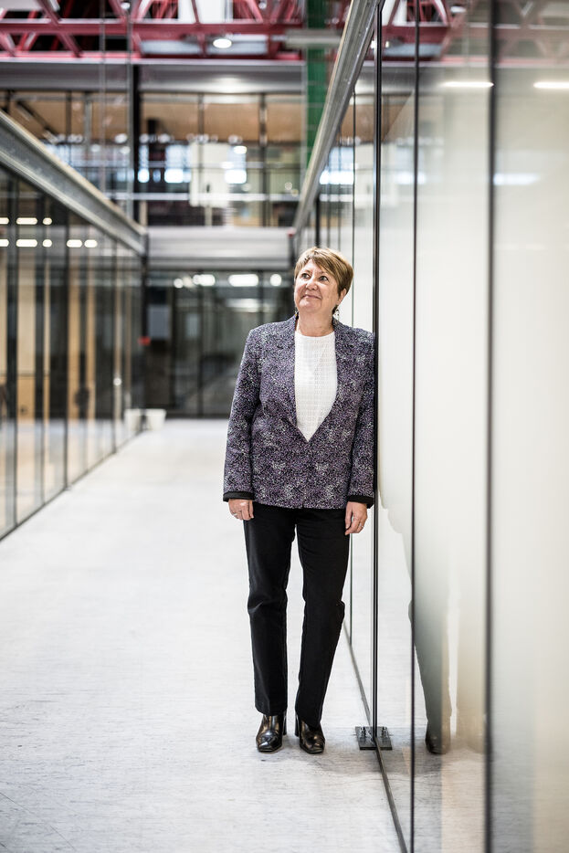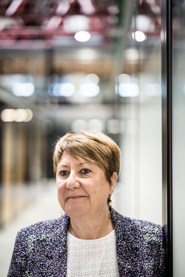 Charleroi, Belgium. 2024-04-25. Portrait of Celine Neven, CEO of UWE, Sylvie Marque, Secretary General of SPW and Lionel Bonjean, Director General of SPW Economy, Employment, Research. Photograph by Valentin Bianchi / Hans Lucas