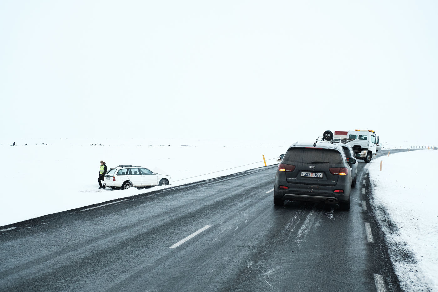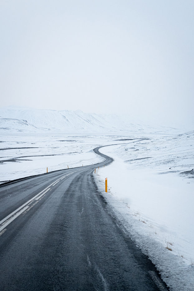 Regard sur les routes islandaises, et particulièrement la Route n° 1. Cet axe de circulation, ouvert dans les années 70 et long de 1339 kilomètres, est la principale route du pays. Elle permet aux touristes de faire le tour de l'île en visitant la plupart des principaux sites touristiques, et aux islandais de se déplacer au quotidien d'une ville à l'autre.