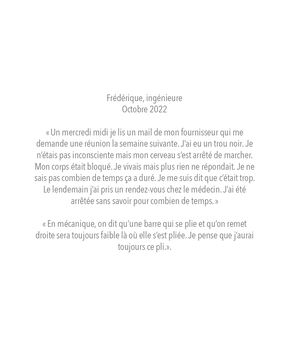 Cette série de portraits s’intéresse au récit de personnes en situation de burn-out. Terme parfois galvaudé, le « syndrome d’épuisement professionnel » correspond à un ensemble de symptômes physiques et psychiques, et ses manifestations ont dans la grande majorité des cas des répercussions jusque dans la vie privée de la personne. Difficile à quantifier car non-reconnu comme maladie professionnelle, le burn-out concernerait 5 à 10% de la population active en France. Au-delà des facteurs qui ont conduit au burn-out, ces témoignages sont marqués par un point de rupture, un basculement, celui du jour où ces salariés et ex-salariés ne sont plus retournés sur leur lieu de travail. Cette série pose en outre la question du bien-être du salarié, et tente d’interroger son rapport au travail et la place que ce dernier occupe aujourd’hui dans nos sociétés.