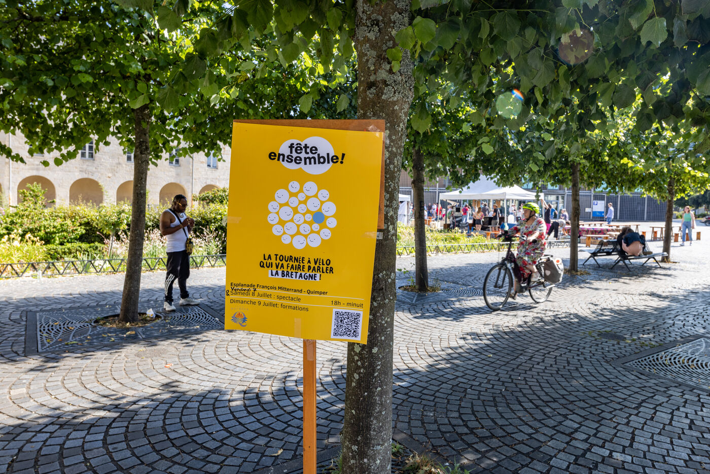 Théatre de rue, le collectif "fête ensemble", une branche du collectif d'artistes-militants écologistes "le bruit qui court" se produit devant le théâtre de Cornouaille à Quimper. En tournée à vélo dans plusieurs villes de Bretagne en Juillet et en Août, chaque représentation est suivie d'un temps d'échange accompagné entre spectateurs et spectatrices pour parler des problématiques environnementales, sociales et des enjeux de coopération décrites par la pièce, le tout suivi d'une soirée dansante ouverte à tous.