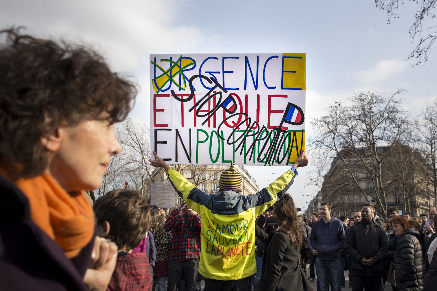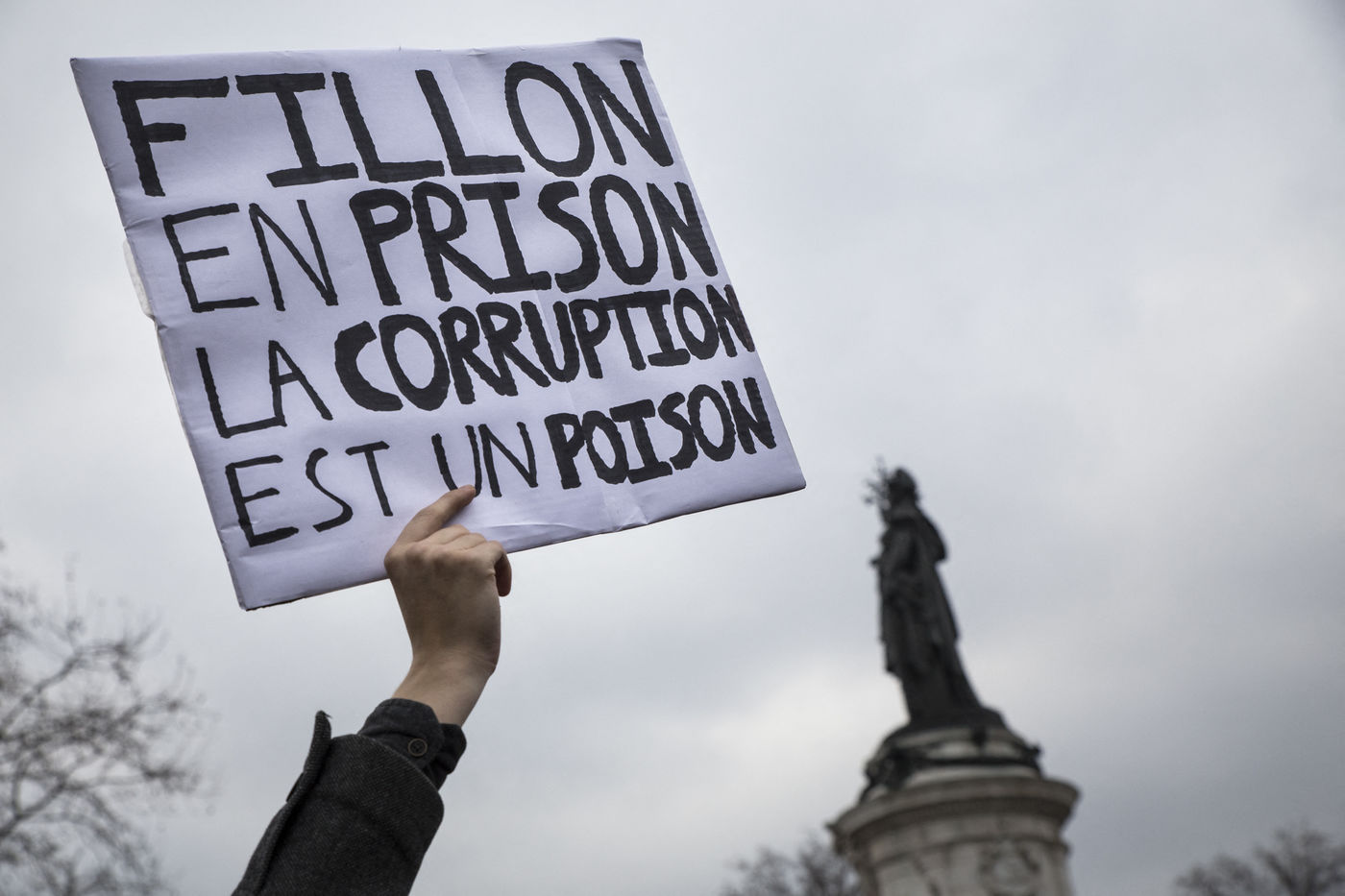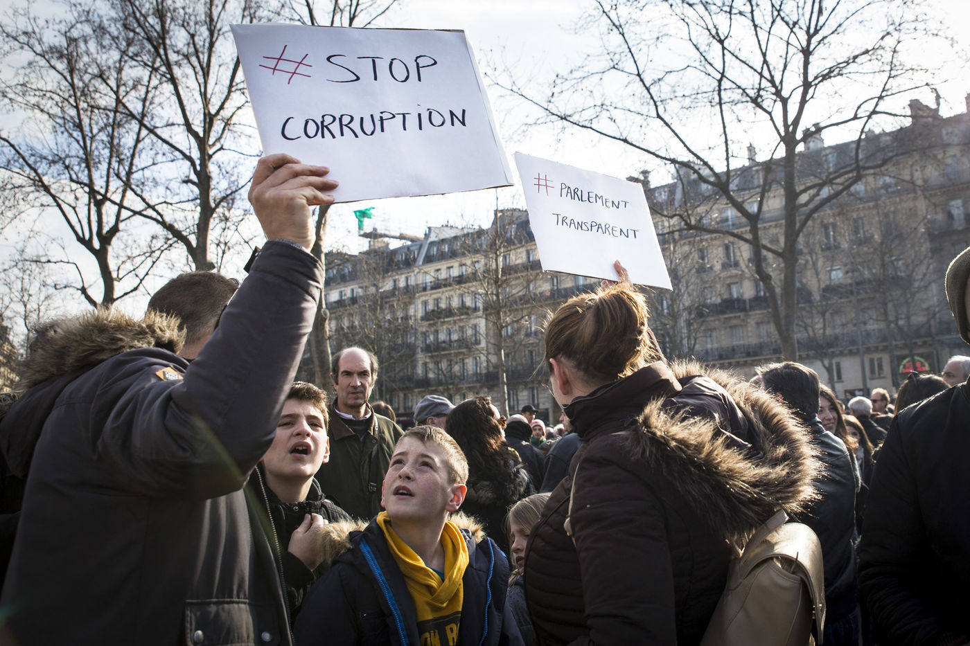 After the Penelope Gate, several hundred people take part in a rally to protest against the corruption of the elected representatives, and ask for the end of their privileges and for a moralization of political life. Place de Republique in Paris on 19 February 2017.