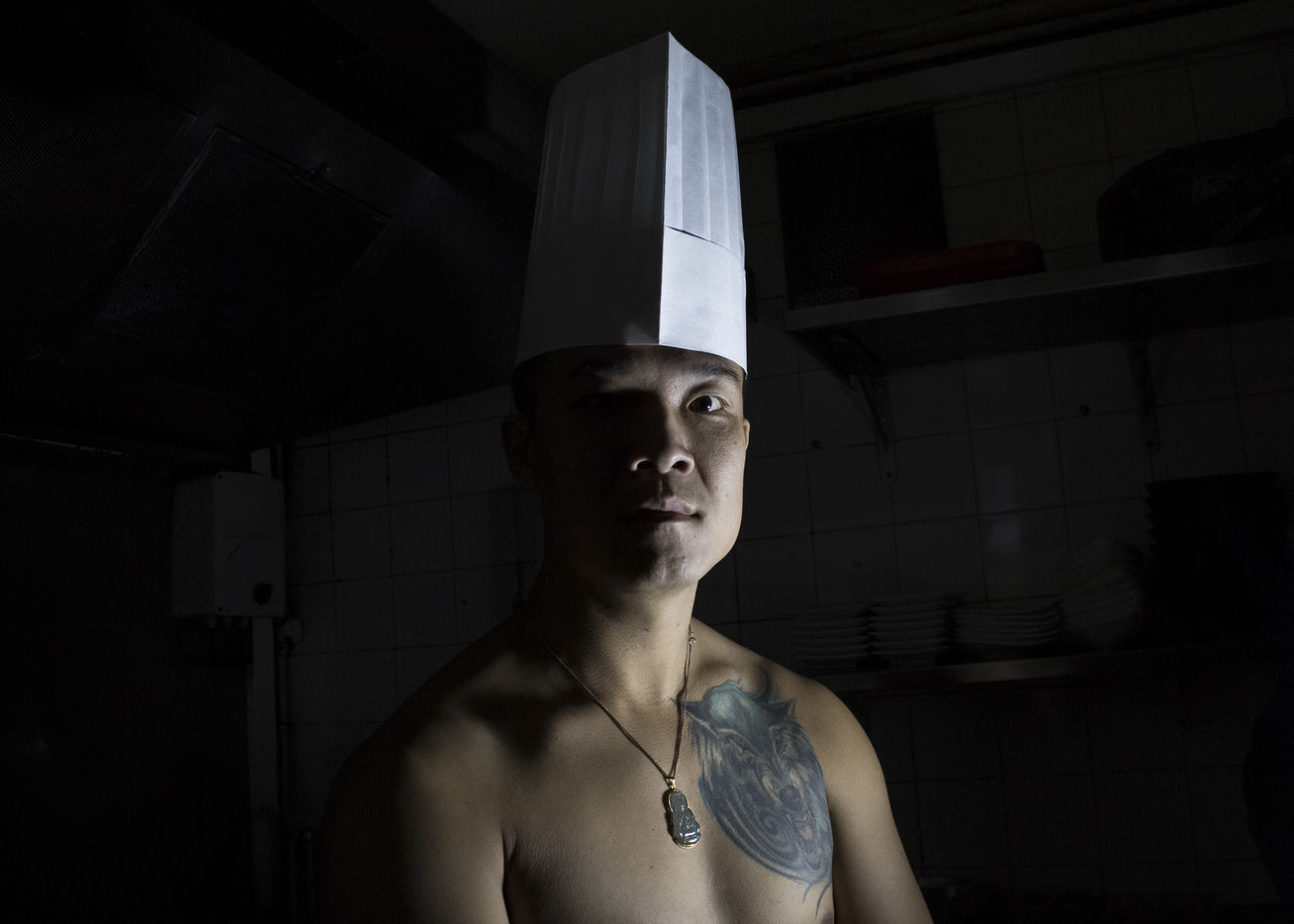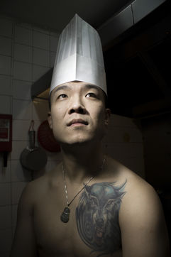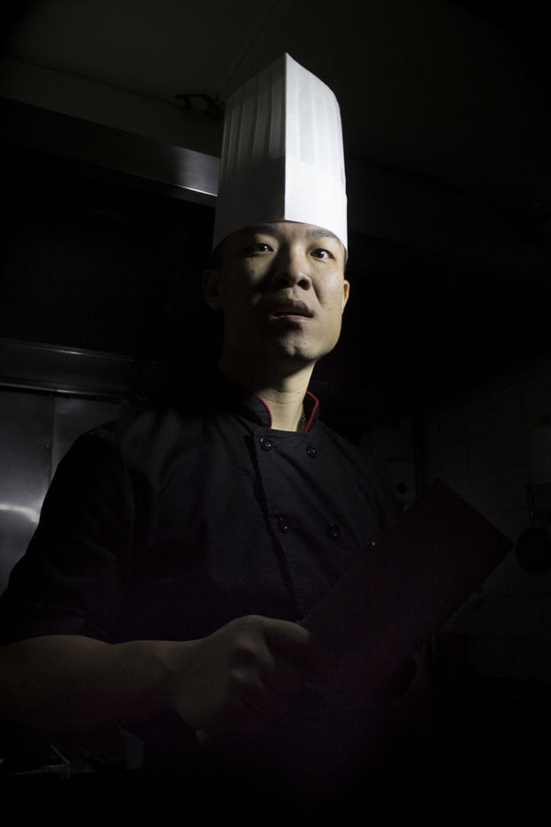 Portrait de Jian GUAN, restaurateur aux abords du marché d'Aligre à Paris, dans le XIIe arrondissement. Jian, ancien légionnaire, pose dans les cuisines de son restaurant, "chez Guan" (ex Fashion Delices) où il réalise ses recettes du nord de la Chine.
