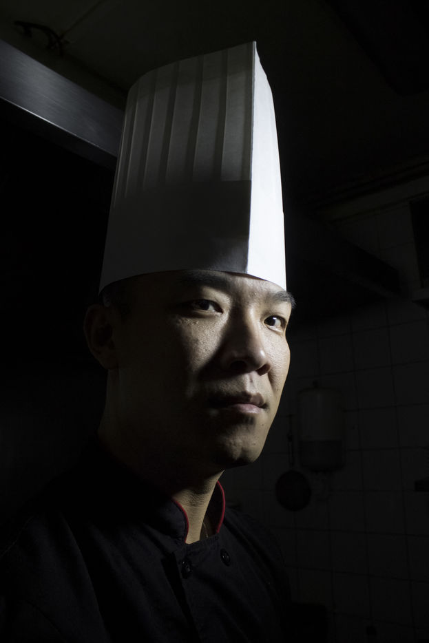 Portrait of Jian GUAN, restaurateur near the market of Aligre in Paris, in the 12th arrondissement. Jian, former legionnaire, poses in the kitchens of his restaurant, "chez Guan" (ex Fashion Delices) where he realizes his recipes of the north of China.