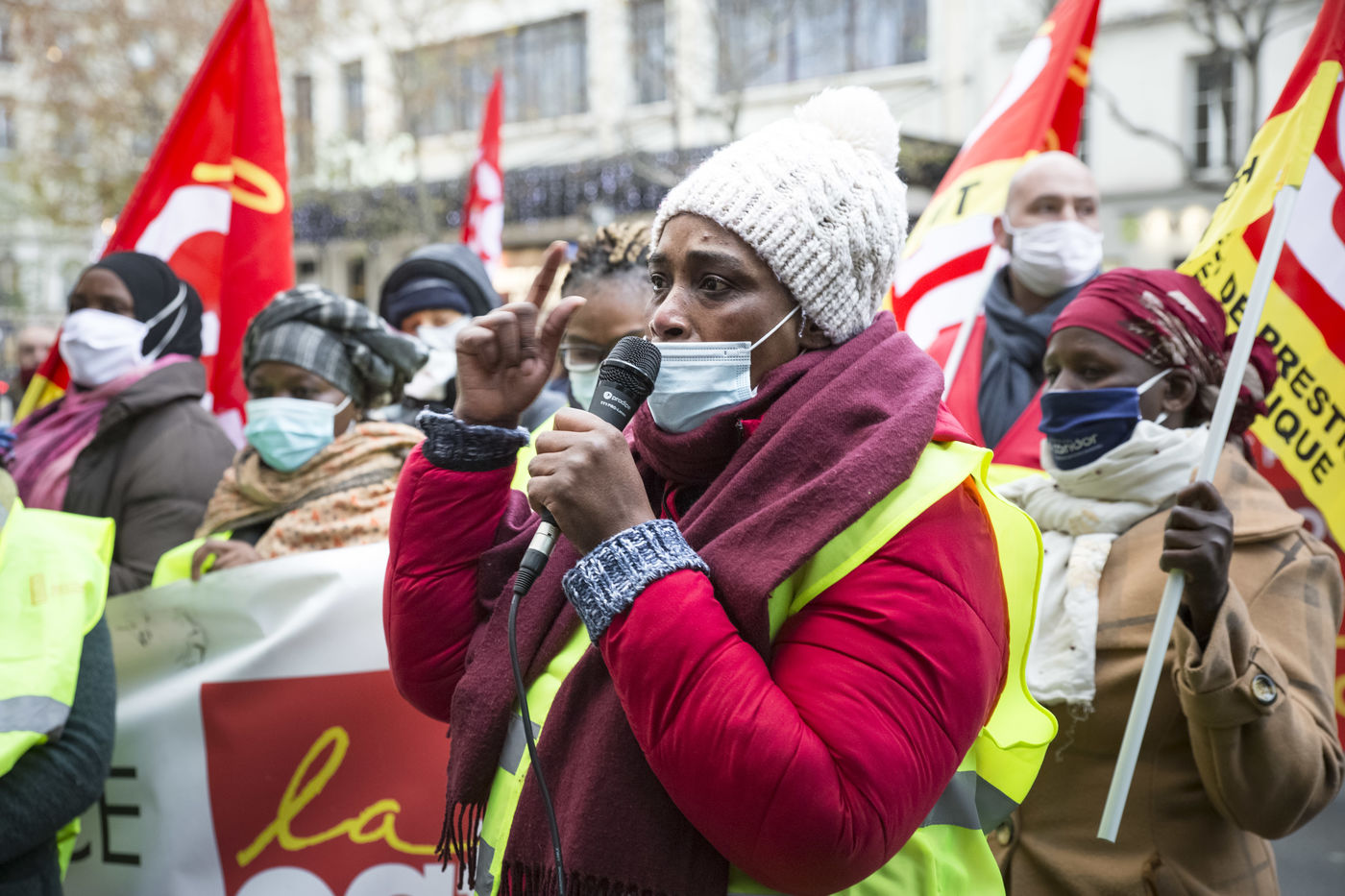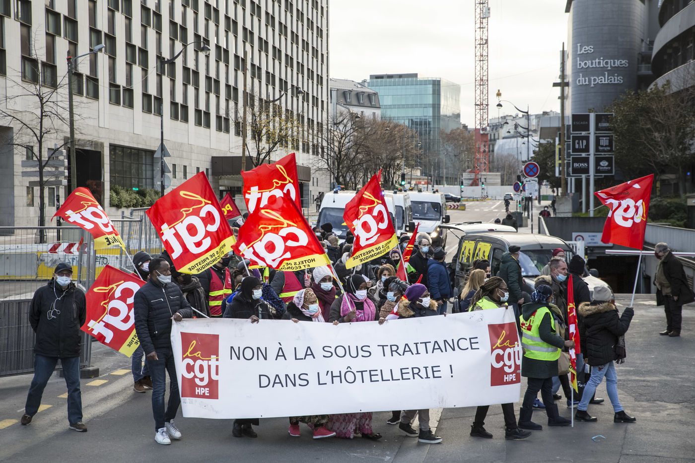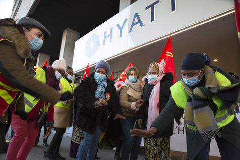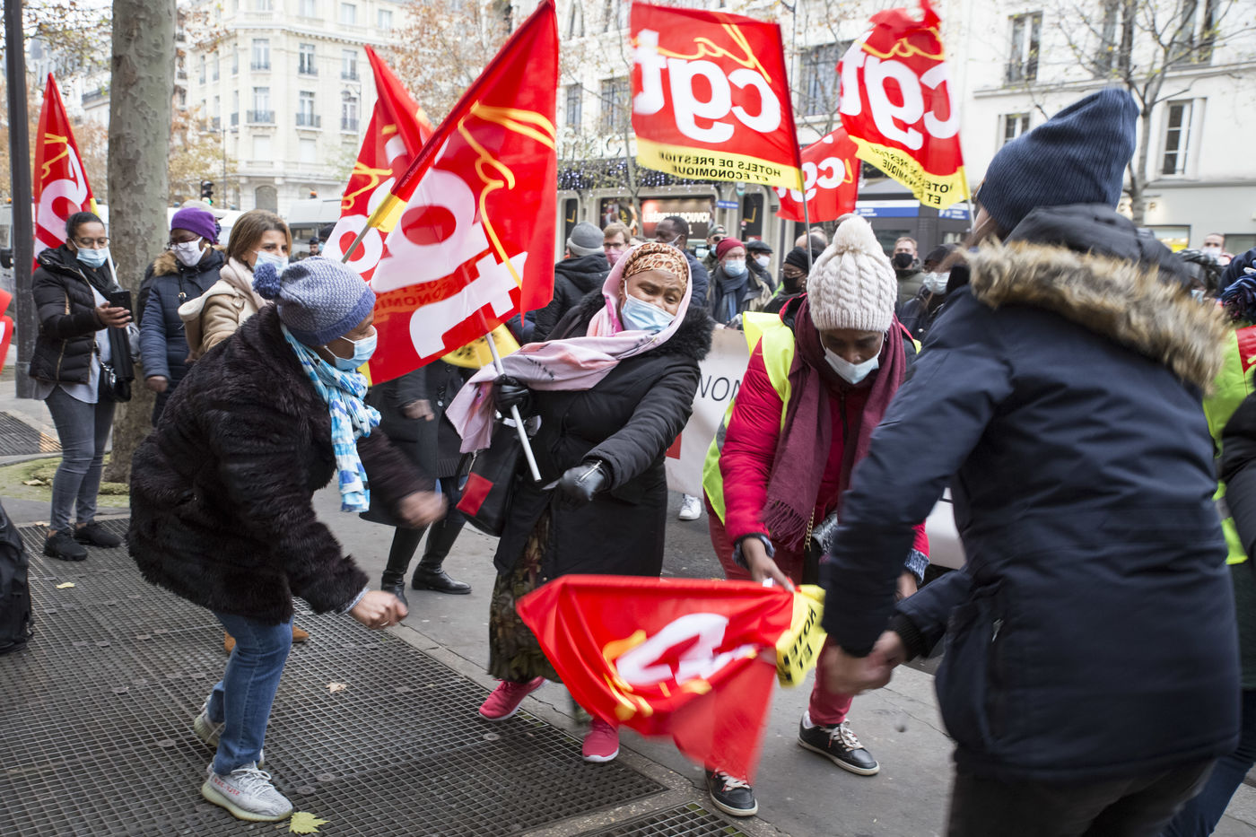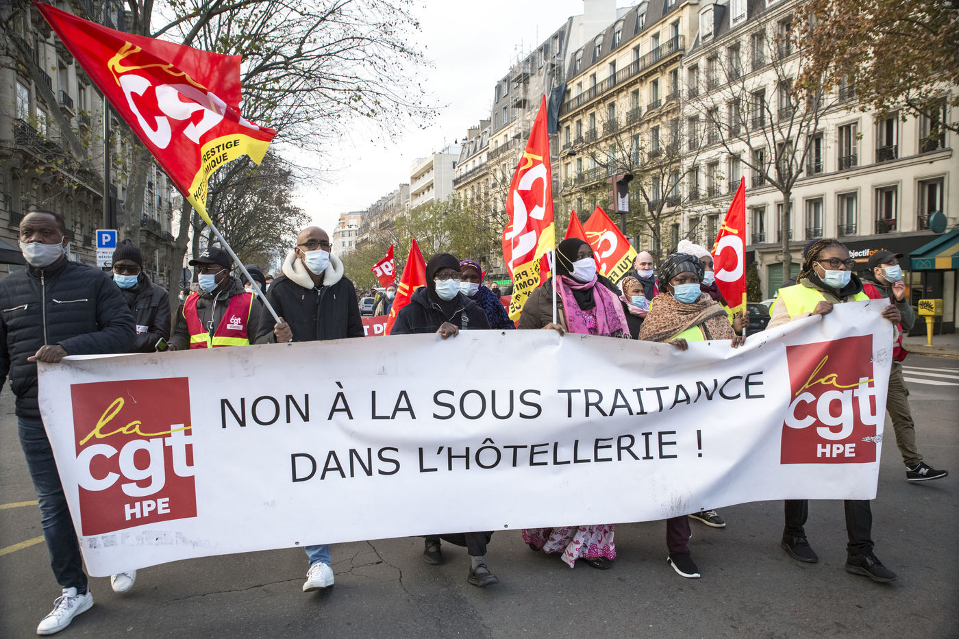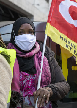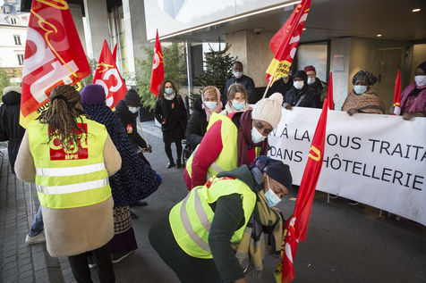 FRANCE, Paris, December 10, 2020. The CGT-HPE union called for a rally to protest against the job cuts and collective performance agreements (2016 labor law agreements). After several announcements of layoffs in the sector, they accuse the large hotel groups of taking advantage of the health crisis to carry out stock market restructuring and outsource services in security or cleaning. This subcontracting makes it possible, during the takeover, to have precarious part-time employees. A small procession composed in part of the housemaids of the hotel Ibis des Batignolles, on strike since July 2019, demonstrated in front of some major Parisian hotels.